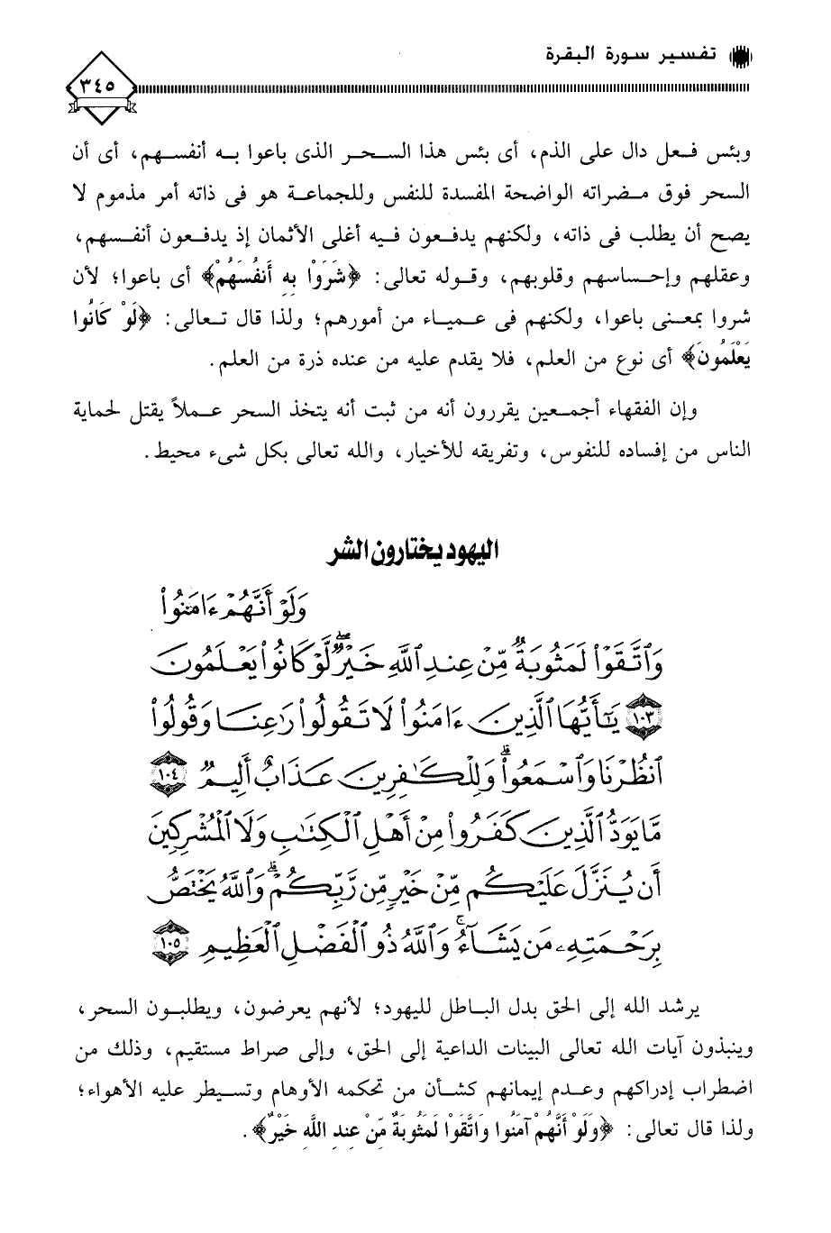 وَلَوْ أَنَّهُمْ آمَنُوا وَاتَّقَوْا لَمَثُوبَةٌ مِنْ عِنْدِ اللَّهِ خَيْرٌ لَوْ كَانُوا يَعْلَمُونَ (103) يَا أَيُّهَا الَّذِينَ آمَنُوا لَا تَقُولُوا رَاعِنَا وَقُولُوا انْظُرْنَا وَاسْمَعُوا وَلِلْكَافِرِينَ عَذَابٌ أَلِيمٌ (104) مَا يَوَدُّ الَّذِينَ كَفَرُوا مِنْ أَهْلِ الْكِتَابِ وَلَا الْمُشْرِكِينَ أَنْ يُنَزَّلَ عَلَيْكُمْ مِنْ خَيْرٍ مِنْ رَبِّكُمْ وَاللَّهُ يَخْتَصُّ بِرَحْمَتِهِ مَنْ يَشَاءُ وَاللَّهُ ذُو الْفَضْلِ الْعَظِيمِ (105)