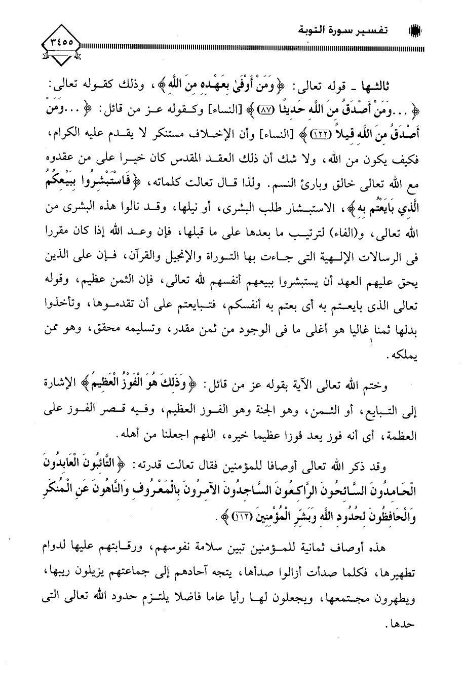 (التَّائِبُونَ الْعَابِدُونَ الْحَامِدُونَ السَّائِحُونَ الرَّاكِعُونَ السَّاجِدُونَ الْآمِرُونَ بِالْمَعْرُوفِ وَالنَّاهُونَ عَنِ الْمُنْكَرِ وَالْحَافِظُونَ لِحُدُودِ اللَّهِ وَبَشِّرِ الْمُؤْمِنِينَ (112)