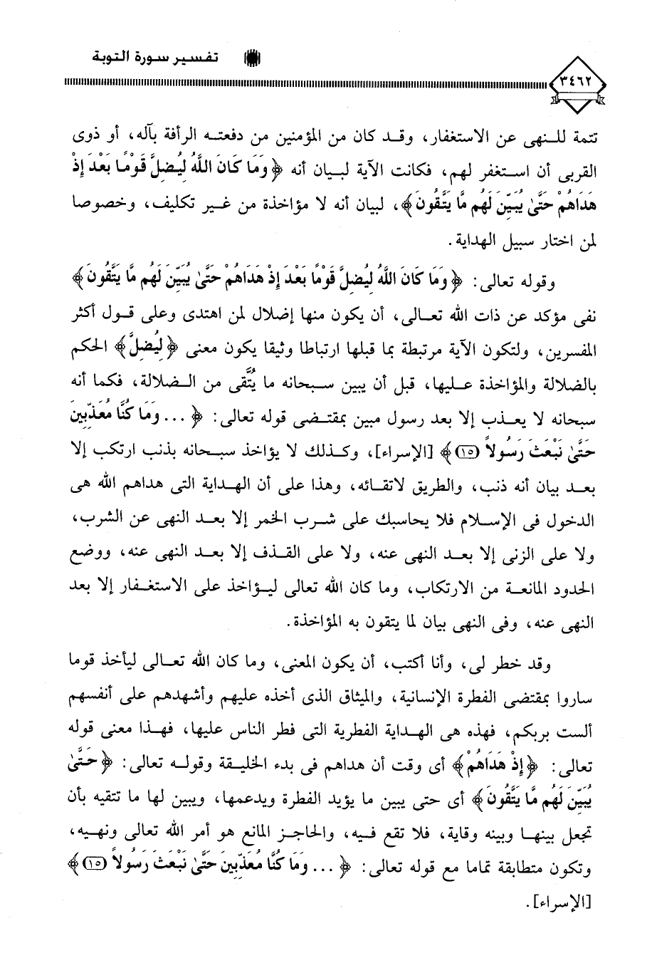 تتمة للنهي عن الاستغفار، وقد كان من المؤمنين من دفعته الرأفة بآله، أو ذوي القربى أن استغفر لهم، فكانت الآية لبيان أنه (وَمَا كَانَ اللَّهُ لِيُضِلَّ قَوْمًا بَعْدَ إِذْ هَدَاهُمْ حَتَّى يُبَيِّنَ لَهُمْ مَا يَتَّقُونَ)، لبيان أنه لَا مؤاخذة من غير تكليف، وخصوصا لمن اختار سبيل الهداية.