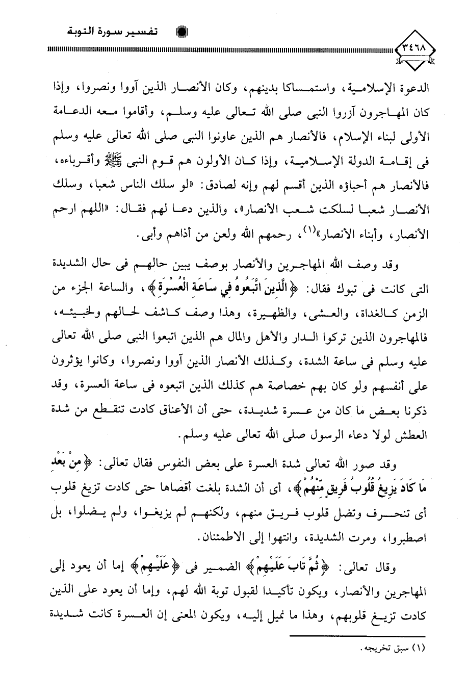وقد وصف اللَّه المهاجرين والأنصار بوصف يبين حالهم في حال الشديدة التي كانت في تبوك ففال: (الَّذِينَ اتَّبَعُوهُ فِي سَاعَةِ الْعُسْرَةِ)، والساعة الجشء من الزمن كالغداة، والعشي، والظهيرة، وهذا وصف كاشف لحالهم ولخبيئه، فالمهاجرون الذين تركوا الدار والأهل والمال هم الذين اتبعوا النبي صلى اللَّه تعالى عليه وسلم في ساعة الشدة، وكذلك الأنصار الذين آووا ونصروا، وكانوا يؤثرون على أنفسهم ولو كان بهم خصاصة هم كذلك الذين اتبعوه في ساعة العسرة، وقد ذكرنا بعض ما كان من عسرة شديدة، حتى أن الأعناق كادت تنقطع من شدة العطش لولا دعاء الرسول صلى اللَّه تعالى عليه وسلم.