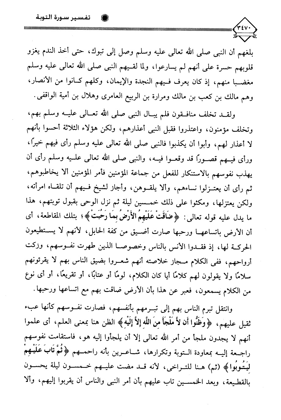 ولقد تخلف منافقون فلم يبال النبي صلى الله تعالى عليه وسلم بهم، وتخلف مؤمنون، واعتذروا فقبل النبي أعذارهم، ولكن هؤلاء الثلاثة أحسوا بأنهم لا أعذار لهم، وأبوا أن يكذبوا فالنبي صلى الله تعالى عليه وسلم رأى فيهم خيرا، ورأى فيهم قصورًا قد وقعوا فيه، والنبي صلى الله تعالى عليه وسلم رأى أن يهذب نفوسهم بالاستنكار للفعل من جماعة المؤمنين فأمر المؤمنين ألا يخاطبوهم، ثم رأى أن يعتزلوا نساءهم، وألا يلقوهن، وأجاز لشيخ فيهم أن تلقاه امرأته، ولكن يعتزلها، ومكثوا على ذلك خمسين ليلة ثم نزل الوحي بقبول توبتهم، هذا ما يدل عليه قوله تعالى: (ضَاقَتْ عَلَيْهِمُ الأَرْضُ بِمَا رَحُبَت)؛ بتلك المقاطعة، أي أن الأرض باتساعها ورحبها صارت أضيق من كفة الحابل، لأنهم لَا يستطيعون الحركة لها، إذ فقدوا الأنس بالناس وخصوصا الذين طهرت نفوسهم، وزكت أرواحهم، ففي الكلام مجاز خلاصته أنهم شعروا بضيق الناس بهم لَا يقرئونهم سلامًا ولا يقولون لهم كلامًا أيا كان الكلام، لومًا أو عتابًا، أو تقريعًا، أو أي نوع من الكلام يسمعون، فعبر عن هذا بأن الأرض ضاقت بهم مع اتساعها ورحبها.