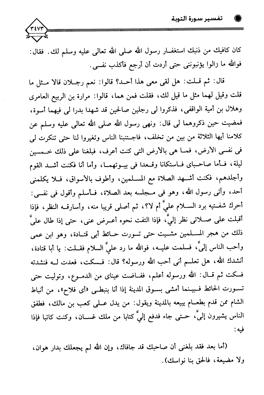 قال: ثم قلت: هل لقي معي هذا أحد؟ قالوا: نعم رجلان قالا مثل ما قلت وقيل لهما مثل ما قيل لك، فقلت فمن هما، قالوا: مرارة بن الربيع العامري وهلال بن أمية الواقفي، فذكروا لي رجلين صالحين قد شهدا بدرا لي فيهما أسوة، فمضيت حين ذكروهما لي قال: ونهى رسول اللَّه صلى اللَّه تعالى عليه وسلم عن كلامنا أيها الثلاثة من بين من تخلف، فاجتنبنا الناس وتغيروا لنا حتى تنكرت لي في نفسي الأرض، فما هي بالأرض التي كنت أعرف، فبلغنا على ذلك خمسين ليلة، فأما صاحباس فاستكانا وقعدا في بيوتهما، وأما أنا فكنت أشد القوم وأجلدهم، فكنت أشهد الصلاة مع المسلمين، وأطوف بالأسواق، فلا يكلمني أحد، وآتي رسول الله، وهو في مجلسه بعد الصلاة، فأسلم وأقول في نفسي: أحرك شفتيه برد السلام عليَّ أم لَا؟، ثم أصلي قريبا منه، وأسارقه النظر، فإذا أقبلت على صلاتي نظر إليَّ، فإذا التفت نحوه أعرض عني، حتى إذا طال على ذلك من هجر المسلمين مشيت حتى تسورت حائط أبي قتادة، وهو ابن عمي وأحب الناس إليَّ، فسلمت عليه، فوالله ما رد عليَّ السلام فقلت: يا أبا قتادة، أنشدك اللَّه، هل تعلم أني أحب اللَّه ورسوله؟ قال: فسكت، فعدت له فنشدته فسكت ثم قال: الله ورسوله أعلم، ففاضت عيناي من الدموع، وتوليت حتى تسورت الحائط فبينما أمشى بسوق المدينة إذا أنا بنبطى " أي فلاح "، من أنباط الشام ممن قدم بطعام يبيعه بالمدينة ويقول: من يدل على كعب بن مالك، فطفق الناس يشيرون إليَّ، حتى جاء فدفع إليَّ كتابا من ملك غسان، وكنت كاتبا فإذا فيه: