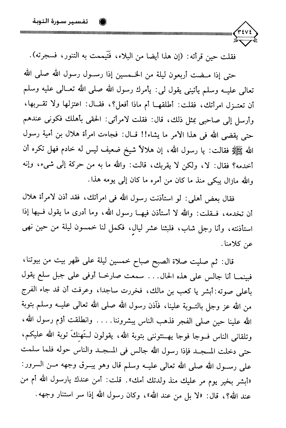 فقال بعض أهلي: لو استأذنت رسول اللَّه في امرأتك، فقد أذن لامرأة هلال أن تخدمه، فقلت: واللَّه لَا أستاذن فيها رسول اللَّه، وما أدرى ما يقول فيها إذا استأذنته، وأنا رجل شاب، فلبثنا عشر ليالٍ، فكمل لنا خمسون ليلة من حين نهى عن كلامنا.