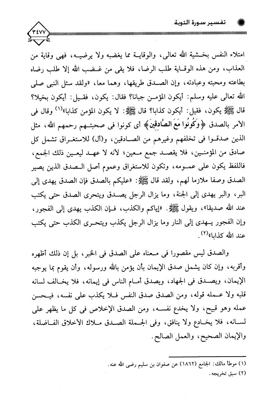 والصدق ليس مقصورا في معناه على الصدق في الخبر، بل إن ذلك أظهره وأقربه، وإن كان يشمل صدق الإيمان بأن يؤمن باللَّه ورسوله، وأن يقوم بما يوجبه الإيمان، ويصدق في الجهاد، ويصدق أمام الناس في إيمانه، فلا يخالف لسانه قلبه ولا عمله قوله، ومن الصدق صدق النفس فلا يكذب على نفسه، فيحسن عمله وهو قبيح، ولا يخدع نفسه، ومن الصدق الإخلاص في كل ما يظهر على لسانه، فلا يخادع ولا ينافق، وفي الجملة الصدق ملاك الأخلاق الفاضلة، والإيمان الصحيح، والعمل الصالح.