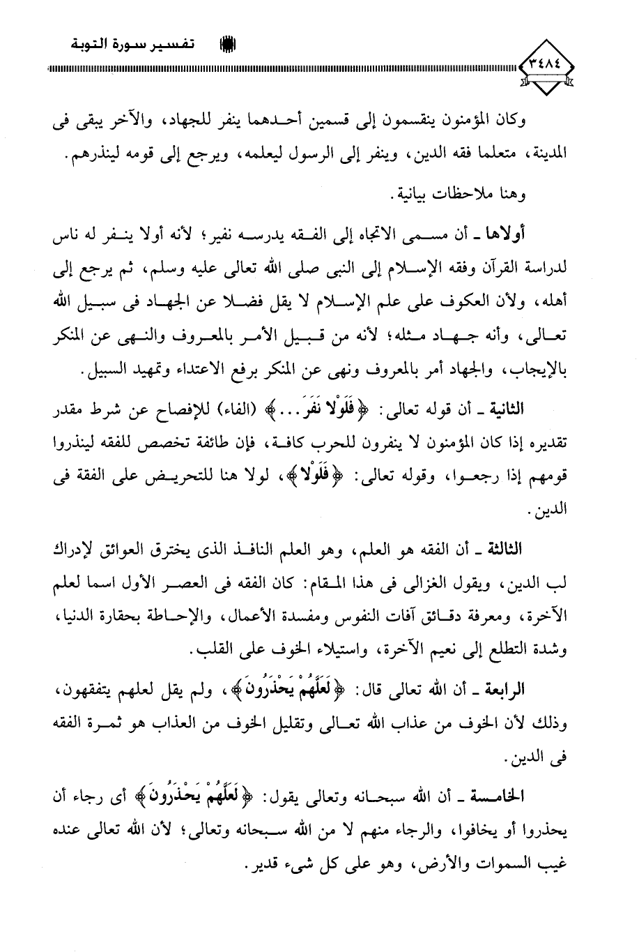 أولاها - أن مسمى الاتجاه إلى الفقه يدرسه نفير؛ لأنه أولا ينفر له ناس لدراسة القرآن وفقه الإسلام إلى النبي صلى اللَّه تعالى عليه وسلم، ثم يرجع إلى أهله، ولأن العكوف على علم الإسلام لَا يقل فضلا عن الجهاد في سبيل اللَّه تعالى، وأنه جهاد مثله؛ لأنه من قبيل الأمر بالمعروف والنهي عن المنكر بالإيجاب، والجهاد أمر بالمعروف ونهي عن المنكر برفع الاعتداء وتمهيد السبيل.