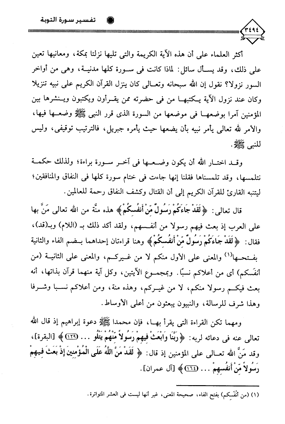 (¬1) (من أنْفَسِكم) بفتح الفاء، صحيحة المعنى، غير أنها ليست في العشر المتواترة.