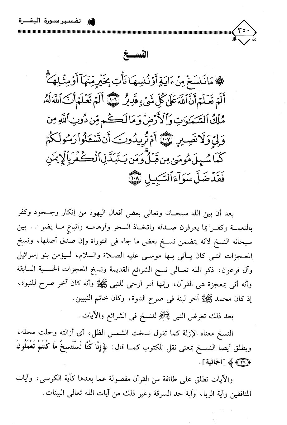 (مَا نَنْسَخْ مِنْ آيَةٍ أَوْ نُنْسِهَا نَأْتِ بِخَيْرٍ مِنْهَا أَوْ مِثْلِهَا أَلَمْ تَعْلَمْ أَنَّ اللَّهَ عَلَى كُلِّ شَيْءٍ قَدِيرٌ (106) أَلَمْ تَعْلَمْ أَنَّ اللَّهَ لَهُ مُلْكُ السَّمَاوَاتِ وَالْأَرْضِ وَمَا لَكُمْ مِنْ دُونِ اللَّهِ مِنْ وَلِيٍّ وَلَا نَصِيرٍ (107) أَمْ تُرِيدُونَ أَنْ تَسْأَلُوا رَسُولَكُمْ كَمَا سُئِلَ مُوسَى مِنْ قَبْلُ وَمَنْ يَتَبَدَّلِ الْكُفْرَ بِالْإِيمَانِ فَقَدْ ضَلَّ سَوَاءَ السَّبِيلِ (108)