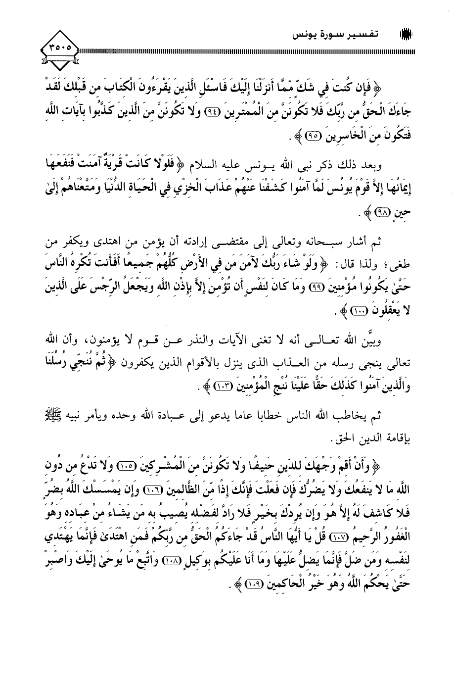 (وَأَنْ أَقِمْ وَجْهَكَ لِلدِّينِ حَنِيفًا وَلَا تَكُونَنَّ مِنَ الْمُشْرِكِينَ (105) وَلَا تَدْعُ مِنْ دُونِ اللَّهِ مَا لَا يَنْفَعُكَ وَلَا يَضُرُّكَ فَإِنْ فَعَلْتَ فَإِنَّكَ إِذًا مِنَ الظَّالِمِينَ (106) وَإِنْ يَمْسَسْكَ اللَّهُ بِضُرٍّ فَلَا كَاشِفَ لَهُ إِلَّا هُوَ وَإِنْ يُرِدْكَ بِخَيْرٍ فَلَا رَادَّ لِفَضْلِهِ يُصِيبُ بِهِ مَنْ يَشَاءُ مِنْ عِبَادِهِ وَهُوَ الْغَفُورُ الرَّحِيمُ (107) قُلْ يَا أَيُّهَا النَّاسُ قَدْ جَاءَكُمُ الْحَقُّ مِنْ رَبِّكُمْ فَمَنِ اهْتَدَى فَإِنَّمَا يَهْتَدِي لِنَفْسِهِ وَمَنْ ضَلَّ فَإِنَّمَا يَضِلُّ عَلَيْهَا وَمَا أَنَا عَلَيْكُمْ بِوَكِيلٍ (108) وَاتَّبِعْ مَا يُوحَى إِلَيْكَ وَاصْبِرْ حَتَّى يَحْكُمَ اللَّهُ وَهُوَ خَيْرُ الْحَاكِمِينَ (109).