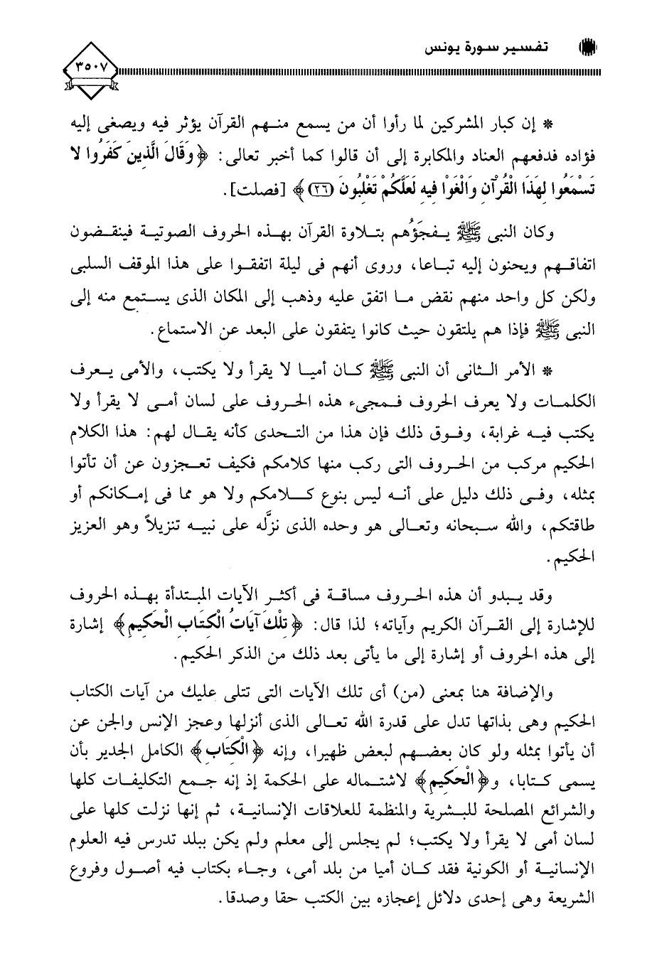 * الأمر الثاني أن النبي - صلى الله عليه وسلم - كان أميا لَا يقرأ ولا يكتب، والأُميّ يعرف الكلمات ولا يعرف الحروف فمجيء هذه الحروف على لسان أمي لَا يقرأ ولا يكتب فيه غرابة، وفوق ذلك فإن هذا من التحدي كأنه يقال لهم: هذا الكلام الحكيم مركب من الحروف التي ركب منها كلامكم فكيف تعجزون عن أن تأتوا بمثله، وفي ذلك دليل على أنه ليس بنوع كلامكم ولا هو مما في إمكانكم أو طاقتكم، واللَّه سبحانه وتعالى هو وحده الذي نزَّله على نبيه تنزيلًا وهو العزيز الحكيم.