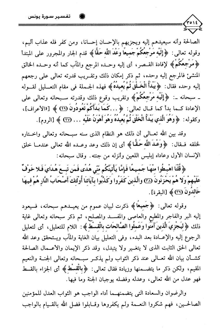 الصالحة وأنه سيعيدهم إليه ويجزيهم بالإحسان إحسانا، ومن كفر فله عذاب أليم، وقوِله تعالى: (إِلَيْهِ مرْجِعُكُمْ جَمِيعًا وَعْدَ اللَّهِ حَقًّا) قدم الجار والمجرور على المبتدأ (مرْجِعُكُمْ) لإفادة القصر، أي إليه وحده المرجع والمآب كما أنه وحده الخالق المنشئ فالمرجع إليه وحده، ثم ذكر إمكان ذلك وتقريب قدرته تعالى على رجعهم إليه وحده فقال: (يَبْدَأ الْخَلْقَ ثُمَّ يُعِيدُهُ) فهذه الجملة في مقام التعليل لقوله - سبحانه -: (إِلَيْهِ مَرْجِعُكُمْ) وتقريب وقوع ذلك وقدرته سبحانه وتعالى على الإعادة كما بدأ كما قال تعالى: (. . . كمَا بَدَأَكُمْ تَعُودُونَ)، وكقوله: (وَهُوَ الَّذِي يَبْدَأُ الْخَلْقَ ثُمَّ يُعِيدُهُ وَهُوَ أَهْوَنُ عَلَيْهِ. . .).