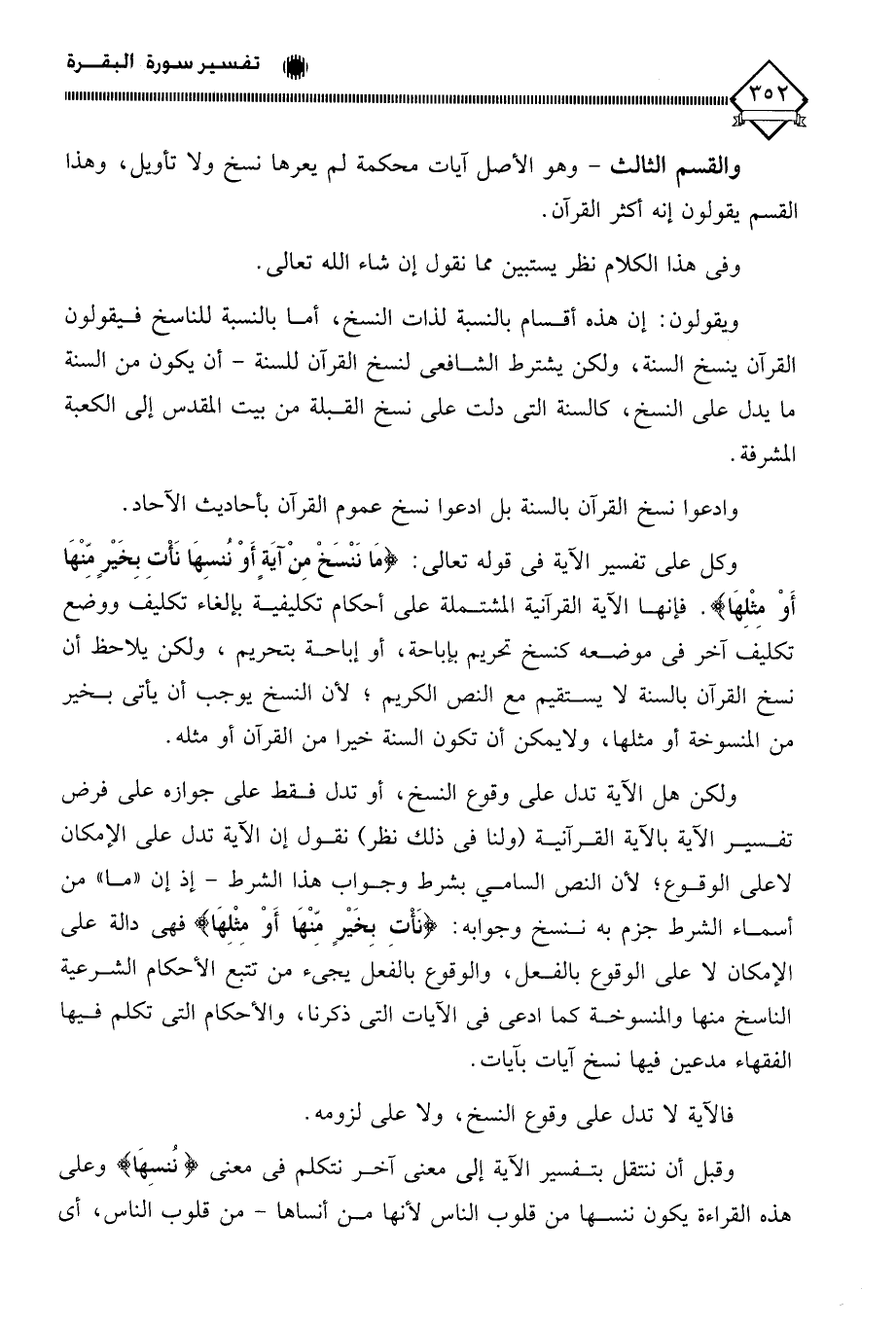 (مَا نَنْسَخْ مِنْ آيَةٍ أَوْ نُنسِهَا نَأْتِ بِخَيْرٍ منْهَا أَوْ مِثْلِهَا). فإنها الآية القرآنية المشتملة على أحكام تكليفية بإلغاء تكليف ووضع تكليف آخر في موضعه كنسخ تحريم بإباحة، أو إباحة بتحريم، ولكن يلاحظ أن نسخ القرآن بالسنة لَا يستقيم مع النص الكريم؛ لأن النسخ يوجب أن يأتي بخير من المنسوخة أو مثلها، ولا يمكن أن تكون السنة خيرا من القرآن أو مثله.