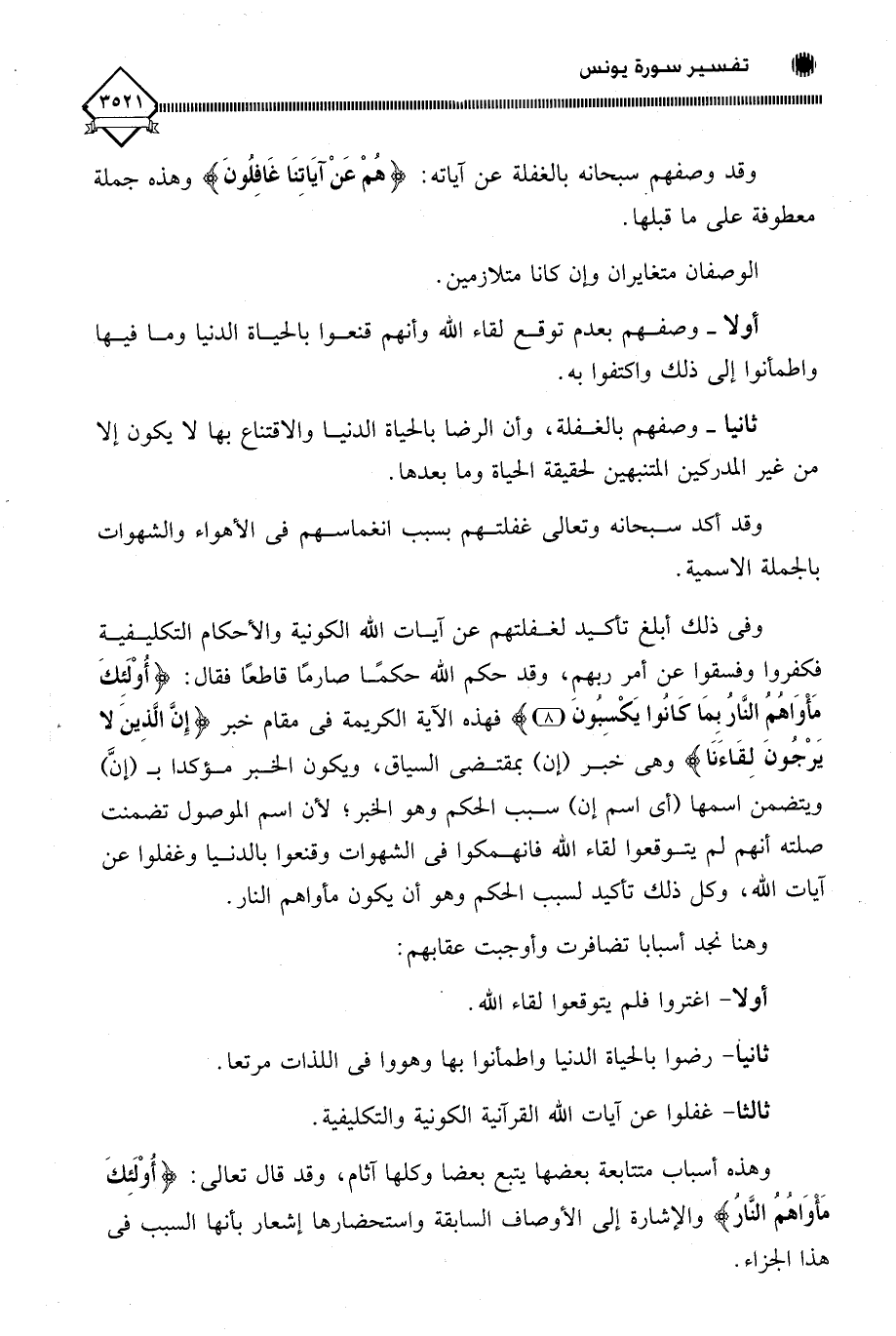 (أُولَئِكَ مَأْوَاهُمُ النَّارُ بِمَا كَانُوا يَكْسِبُونَ (8) فهذه الآية الكريمة في مقام خبر (إِنَّ الَّذِينَ لا يَرْجُون لِقَاءنَا) وهي خبر (إن) بمقتضى السياق، ويكون الخبر مؤكداب (إنَّ) ويتضمن اسمها (أي اسم إن) سبب الحكم وهو الخبر؛ لأن اسم الموصول تضمنت صلته أنهم لم يتوقعوا لقاء اللَّه فانهمكوا في الشهوات وقنعوا بالدنيا وغفلوا عن آيات اللَّه، وكل ذلك تأكيد لسبب الحكم وهو أن يكون مأواهم النار.