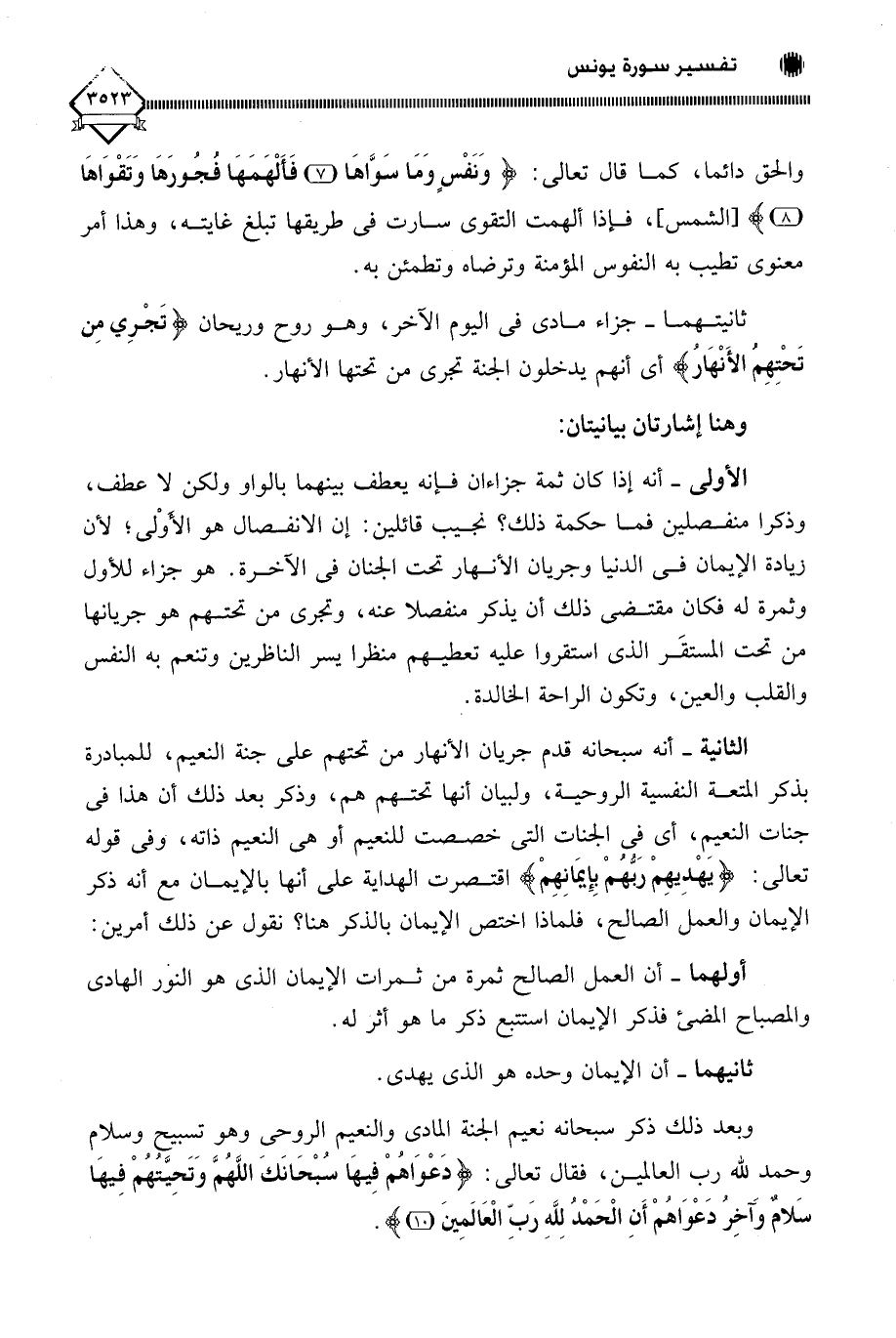 الثانية - أنه سبحانه قدم جريان الأنهار من تحتهم على جنة النعيم، للمبادرة بذكر المتعة النفسية الروحية، ولبيان أنها تحتهم هم، وذكر بعد ذلك أن هذا في جنات النعيمِ، أي في الجنات التي خصصت للنعيم أو هي النعيم ذاته، وفي قوله تعالى: (يهْدِيهِمْ رَبُّهمْ بِإِيمَانِهِمْ) اقتصرت الهداية على أنها بالإيمان مع أنه ذي الإيمان والعمل الصالح، فلماذا اختص الإيمان بالذكر هنا؛ نقول عن ذلك أمرين: أولهما - أن العمل الصالح ثمرة من ثمرات الإيمان الذي هو النور الهادي والمصباح المضيء فذكر الإيمان استتبع ذكر ما هو أثر له.
