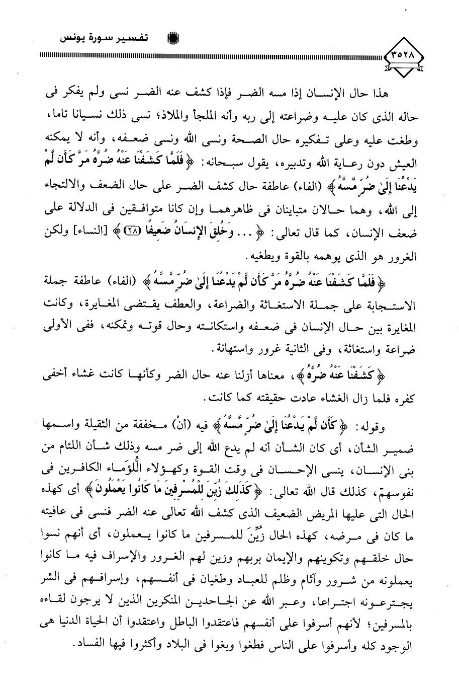 هذا حال الإنسان إذا مسه الضر فإذا كشف عنه الضر نسى ولم يفكر في حاله الذي كان عليه وضراعته إلى ربه وأنه الملجأ والملاذ؛ نسى ذلك نسيانا تاما، وطغت عليه وعلى تفكيره حال الصحة ونسي اللَّه ونسي ضعفه، وأنه لَا يمكنه العيش دون رعاية اللَّه وتدبيره، يقول سبحانه: (فَلَمَّا كَشَفْنَا عَنْهُ ضُرَّهُ مَرَّ كَأَن لَّمْ يَدْعُنَا إِلَى ضرٍّ مسَّه) (الفاء) عاطفة حال كشف الضر على حال الضعف والالتجاء إلى اللَّه، وهما حالان متباينان في ظاهرهما وإن كانا متوِافقين في الدلالة على ضعف الإنسان، كما قال تعالى: (. . . وَخُلِقَ الإِنسَان ضَعِيفًا)، ولكن الغرور هو الذي يوهمه بالقوة ويطغيه.