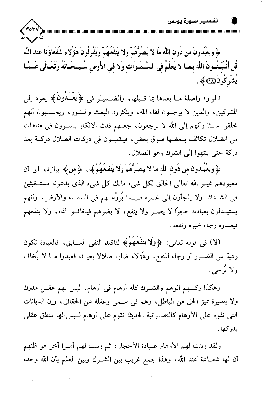(وَيَعْبُدُونَ مِنْ دُونِ اللَّهِ مَا لَا يَضُرُّهُمْ وَلَا يَنْفَعُهُمْ وَيَقُولُونَ هَؤُلَاءِ شُفَعَاؤُنَا عِنْدَ اللَّهِ قُلْ أَتُنَبِّئُونَ اللَّهَ بِمَا لَا يَعْلَمُ فِي السَّمَاوَاتِ وَلَا فِي الْأَرْضِ سُبْحَانَهُ وَتَعَالَى عَمَّا يُشْرِكُونَ (18)