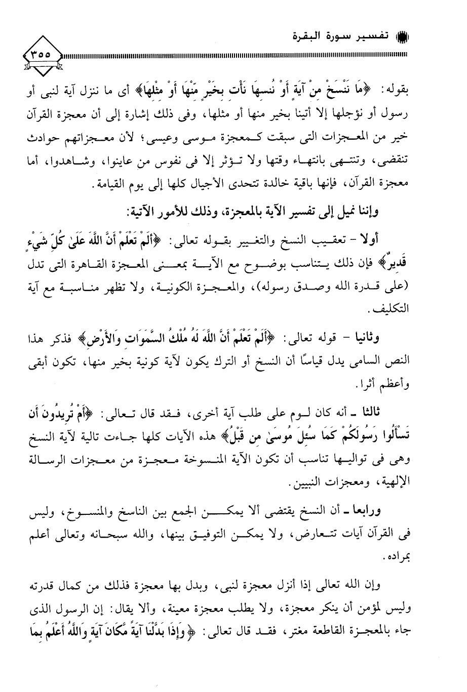 أولا - تعقيب النسخ والتغيير بقوله تعالى: (ألَمْ تَعْلَمْ أَنَّ اللَّهَ عَلَى كُلِّ شَيْءٍ قَدِيرٌ) فإن ذلك يتناسب بوضوح مع الآية بمعنى المعجزة القاهرة التي تدل (على قدرة الله وصدق رسوله)، والمعجزة الكونية، ولا تظهر مناسبة مع آية التكليف.