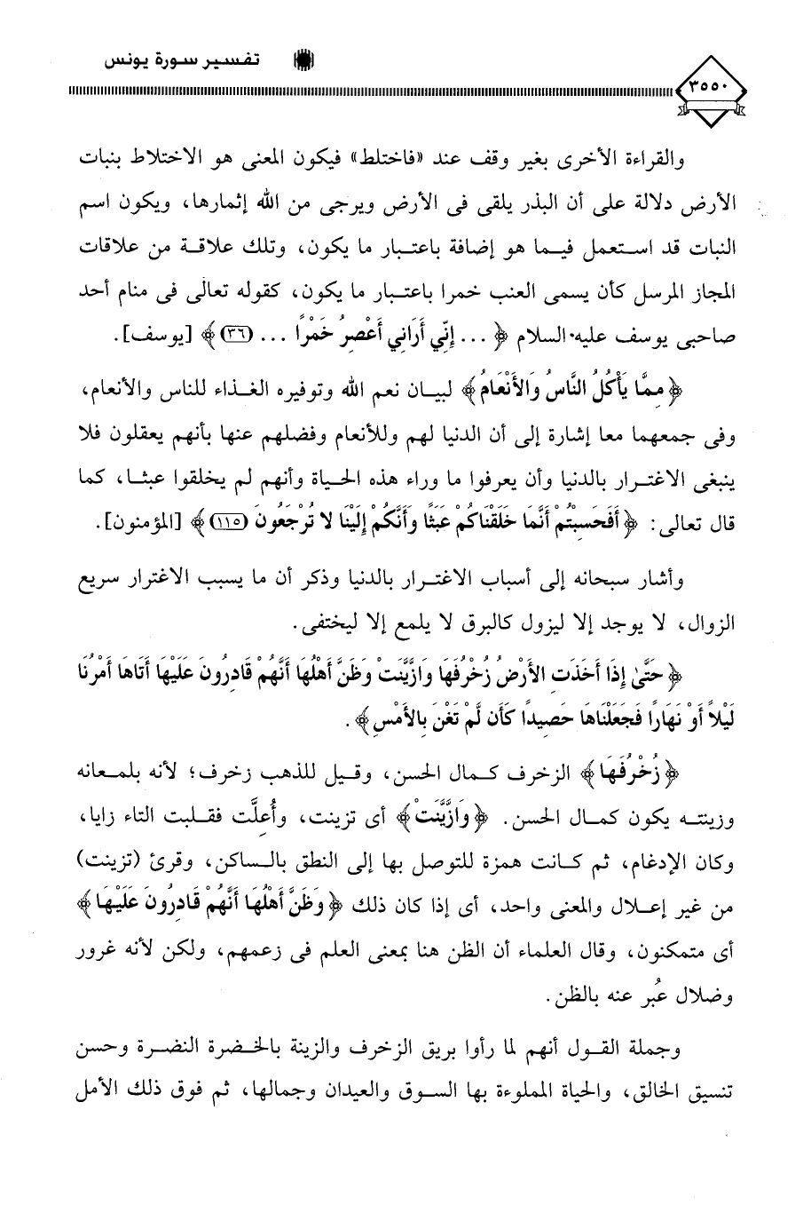 والقراءة الأخرى بغير وقف عند " فاختلط " فيكون المعنى هو الاختلاط بنبات الأرض دلالة على أن البذر يلقى في الأرض ويرجى من اللَّه إثمارها، ويكون اسم النبات قد استعمل فيما هو إضافة باعتبار ما يكون، وتلك علاقة من علاقات المجاز المرسل كأن يسمى العنب خمرا باعتبار ما يكون، كقوله تعالى في منام أحد صاحبي يوسف عليه. السلام (. . . إِنِّي أَرَانِي أَعْصِرُ خَمْرًا. . .). (مِمَّا يَأْكُلُ النَّاسُ وَالأَنْعَامُ) لبيان نعم اللَّه وتوفيره الغذاء للناس والأنعام، وفى جمعهما معا إشارة إلى أن الدنيا لهم وللأنعام وفضلهم عنها بأنهم يعقلون فلا ينبغي الاغترار بالدنيا وأن يعرفوا ما وراء هذه الحياة وأنهم لم يخلقوا عبثا، كما قال تعالى: (أَفَحَسِبْتُمْ أَنَّمَا خَلَقْنَاكمْ عَبَثًا وَأَنَّكُمْ إِلَيْنَا لَا تُرْجَعُونَ).