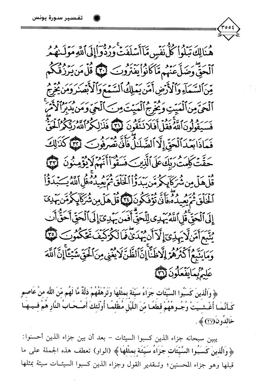 هُنَالِكَ تَبْلُو كُلُّ نَفْسٍ مَا أَسْلَفَتْ وَرُدُّوا إِلَى اللَّهِ مَوْلَاهُمُ الْحَقِّ وَضَلَّ عَنْهُمْ مَا كَانُوا يَفْتَرُونَ (30) قُلْ مَنْ يَرْزُقُكُمْ مِنَ السَّمَاءِ وَالْأَرْضِ أَمَّنْ يَمْلِكُ السَّمْعَ وَالْأَبْصَارَ وَمَنْ يُخْرِجُ الْحَيَّ مِنَ الْمَيِّتِ وَيُخْرِجُ الْمَيِّتَ مِنَ الْحَيِّ وَمَنْ يُدَبِّرُ الْأَمْرَ فَسَيَقُولُونَ اللَّهُ فَقُلْ أَفَلَا تَتَّقُونَ (31) فَذَلِكُمُ اللَّهُ رَبُّكُمُ الْحَقُّ فَمَاذَا بَعْدَ الْحَقِّ إِلَّا الضَّلَالُ فَأَنَّى تُصْرَفُونَ (32) كَذَلِكَ حَقَّتْ كَلِمَتُ رَبِّكَ عَلَى الَّذِينَ فَسَقُوا أَنَّهُمْ لَا يُؤْمِنُونَ (33) قُلْ هَلْ مِنْ شُرَكَائِكُمْ مَنْ يَبْدَأُ الْخَلْقَ ثُمَّ يُعِيدُهُ قُلِ اللَّهُ يَبْدَأُ الْخَلْقَ ثُمَّ يُعِيدُهُ فَأَنَّى تُؤْفَكُونَ (34) قُلْ هَلْ مِنْ شُرَكَائِكُمْ مَنْ يَهْدِي إِلَى الْحَقِّ قُلِ اللَّهُ يَهْدِي لِلْحَقِّ أَفَمَنْ يَهْدِي إِلَى الْحَقِّ أَحَقُّ أَنْ يُتَّبَعَ أَمَّنْ لَا يَهِدِّي إِلَّا أَنْ يُهْدَى فَمَا لَكُمْ كَيْفَ تَحْكُمُونَ (35) وَمَا يَتَّبِعُ أَكْثَرُهُمْ إِلَّا ظَنًّا إِنَّ الظَّنَّ لَا يُغْنِي مِنَ الْحَقِّ شَيْئًا إِنَّ اللَّهَ عَلِيمٌ بِمَا يَفْعَلُونَ (36)