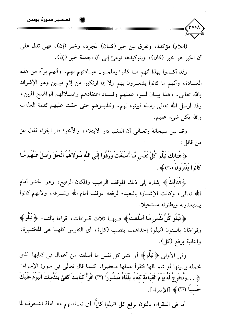 (هُنَالِكَ تَبْلُو كُلُّ نَفْسٍ مَا أَسْلَفَتْ وَرُدُّوا إِلَى اللَّهِ مَوْلَاهُمُ الْحَقِّ وَضَلَّ عَنْهُمْ مَا كَانُوا يَفْتَرُونَ (30)