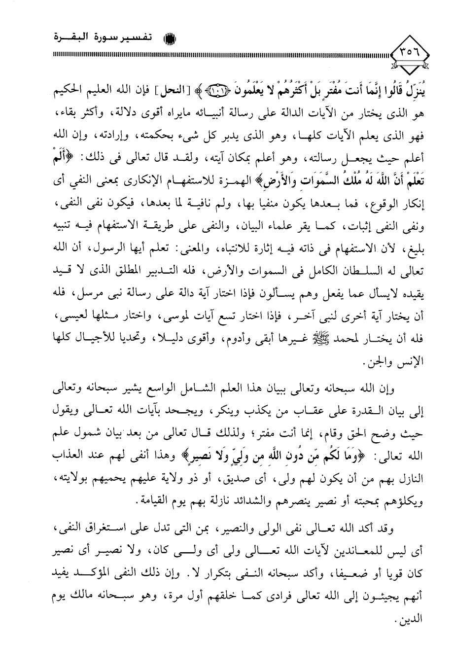 يُنَزِّل قَالُوا إِنَّمَا أَنتَ مُفْتَرٍ بَلْ أَكْثَرهُمْ لَا يَعْلَمُونَ)، فإن الله العليم الحكيم هو الذي يختار من الآيات الدالة على رسالة أنبيائه ما يراه أقوى دلالة، وأكثر بقاء، فهو الذي يعلم الآيات كلها، وهو الذي يدبر كل شيء بحكمته، وإرادته، وإن الله أعلم حيث يجعل رسالته، وهو أعلم بمكان آيته، ولقد قال تعالى في ذلك: (أَلَمْ تَعْلَمْ أَنَّ اللَّهَ لَهُ مُلْكُ السَّمَاوَاتِ وَالْأَرْضِ) الهمزة للاستفهام الإنكاري بمعنى النفي أي إنكار الوقوع، فما بعدها يكون منفيا بها، ولم نافية لما بعدها، فيكون نفي النفي، ونفي النفي إثبات، كما يقر علماء البيان، والنفي على طريقة الاستفهام فيه تنبيه بليغ، لأن الاستفهام في ذاته فيه إثارة للانتباه، والمعنى: تعلم أيها الرسول، أن الله تعالى له السلطان الكامل في السماوات والأرض، فله التدبير المطلق الذي لَا قيد يقيده لَا يسأل عما يفعل وهم يسألون فإذا اختار آية دالة على رسالة نبي مرسل، فله أن يختار آية أخرى لنبي آخر، فإذا اختار تسع آيات لموسى، واختار مثلها لعيسى، فله أن يختار لمحمد - صلى الله عليه وسلم - غيرها أبقى وأدوم، وأقوى دليلا، وتحديا للأجيال كلها الإنس والجن.