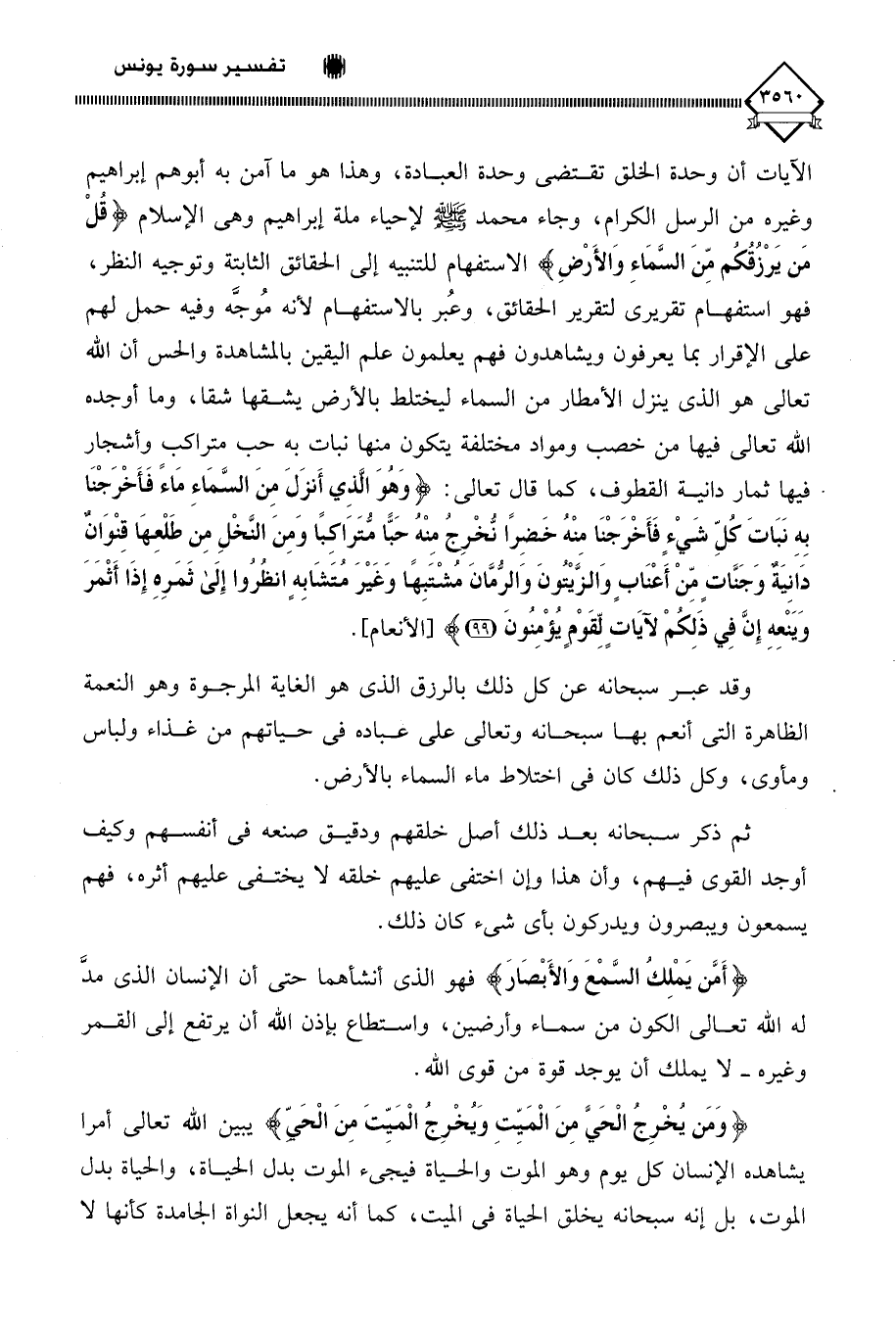 الآيات أن وحدة الخلق تقتضي وحدة العبادة، وهذا هو ما آمن به أبوهم إبراهيم وغيره من الرسل الكرام، وجاء محمد - صلى الله عليه وسلم - لإحياء ملة إبراهيم وهي الإسلام (قُلْ مَن يرْزُقُكُم مِّنَ السَّمَاءِ وَالأَرْضِ) الاستفهام للتنبيه إلى الحقائق الثابتة وتوجيه النظر، فهو استفهام تقريري لتقرير الحقائق، وعُبر بالاستفهام لأنه مُوجَّه وفيه حمل لهم على الإقرار بما يعرفون ويشاهدون فهم يعلمون علم اليقين بالمشاهدة والحس أن اللَّه تعالى هو الذي ينزل الأمطار من السماء ليختلط بالأرض يشقها شقا، وما أوجده اللَّه تعالى فيها من خصب ومواد مختلفة يتكون منها نبات به حب متراكب وأشجار فيها ثمار دانية القطوف، كما قال تعالى: (وَهُوَ الَّذِي أَنْزَلَ مِنَ السَّمَاءِ مَاءً فَأَخْرَجْنَا بِهِ نَبَاتَ كُلِّ شَيْءٍ فَأَخْرَجْنَا مِنْهُ خَضِرًا نُخْرِجُ مِنْهُ حَبًّا مُتَرَاكِبًا وَمِنَ النَّخْلِ مِنْ طَلْعِهَا قِنْوَانٌ دَانِيَةٌ وَجَنَّاتٍ مِنْ أَعْنَابٍ وَالزَّيْتُونَ وَالرُّمَّانَ مُشْتَبِهًا وَغَيْرَ مُتَشَابِهٍ انْظُرُوا إِلَى ثَمَرِهِ إِذَا أَثْمَرَ وَيَنْعِهِ إِنَّ فِي ذَلِكُمْ لَآيَاتٍ لِقَوْمٍ يُؤْمِنُونَ (99).