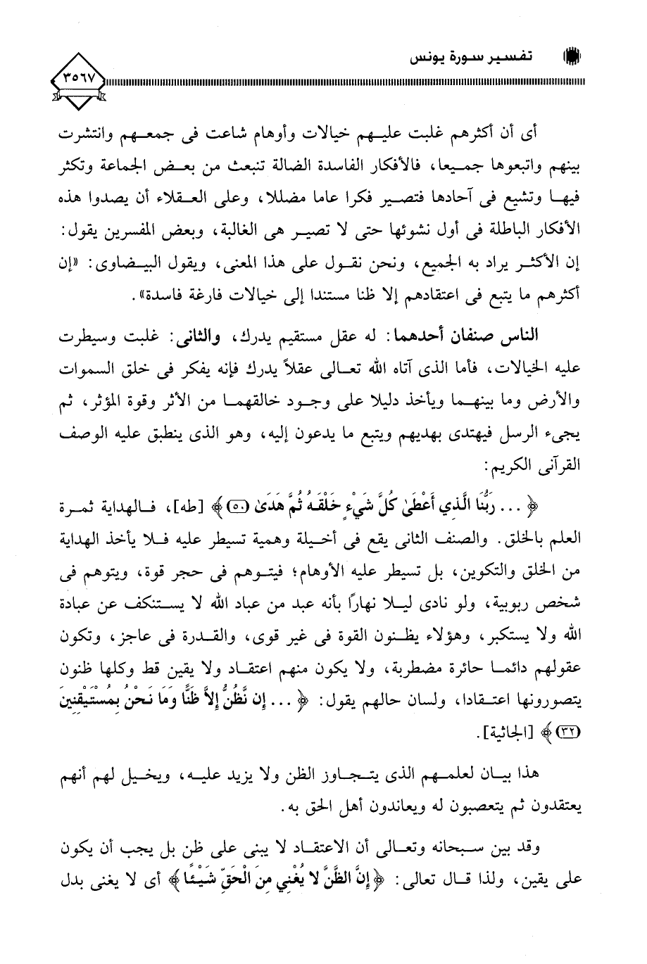 (. . . رَبُّنَا الَّذِي أَعْطَى كُلَّ شَيْءٍ خَلْقَة ثمَّ هَدَى)، فالهداية ثمرة العلم بالخلق. والصنف الثاني يقع في أخيلة وهمية تسيطر عليه فلا يأخذ الهداية من الخلق والتكوين، بل تسيطر عليه الأوهام؛ فيتوهم في حجر قوة، ويتوهم في شخص ربوبية، ولو نادى ليلا نهارًا بأنه عبد من عباد اللَّه لَا يستنكف عن عبادة اللَّه ولا يستكبر، وهؤلاء يظنون القوة في غير قوى، والقدرة في عاجز، وتكون عقولهم دائما حائرة مضطربة، ولا يكون منهم اعتقاد ولا يقين قط وكلها ظنون يتصورونها اعتقادا، ولسان حالهم يقول: (. . . إِن نَّظُنُّ إِلَّا ظَنًّا وَمَا نَحْنُ بِمُسْتَيْقِنِينَ).