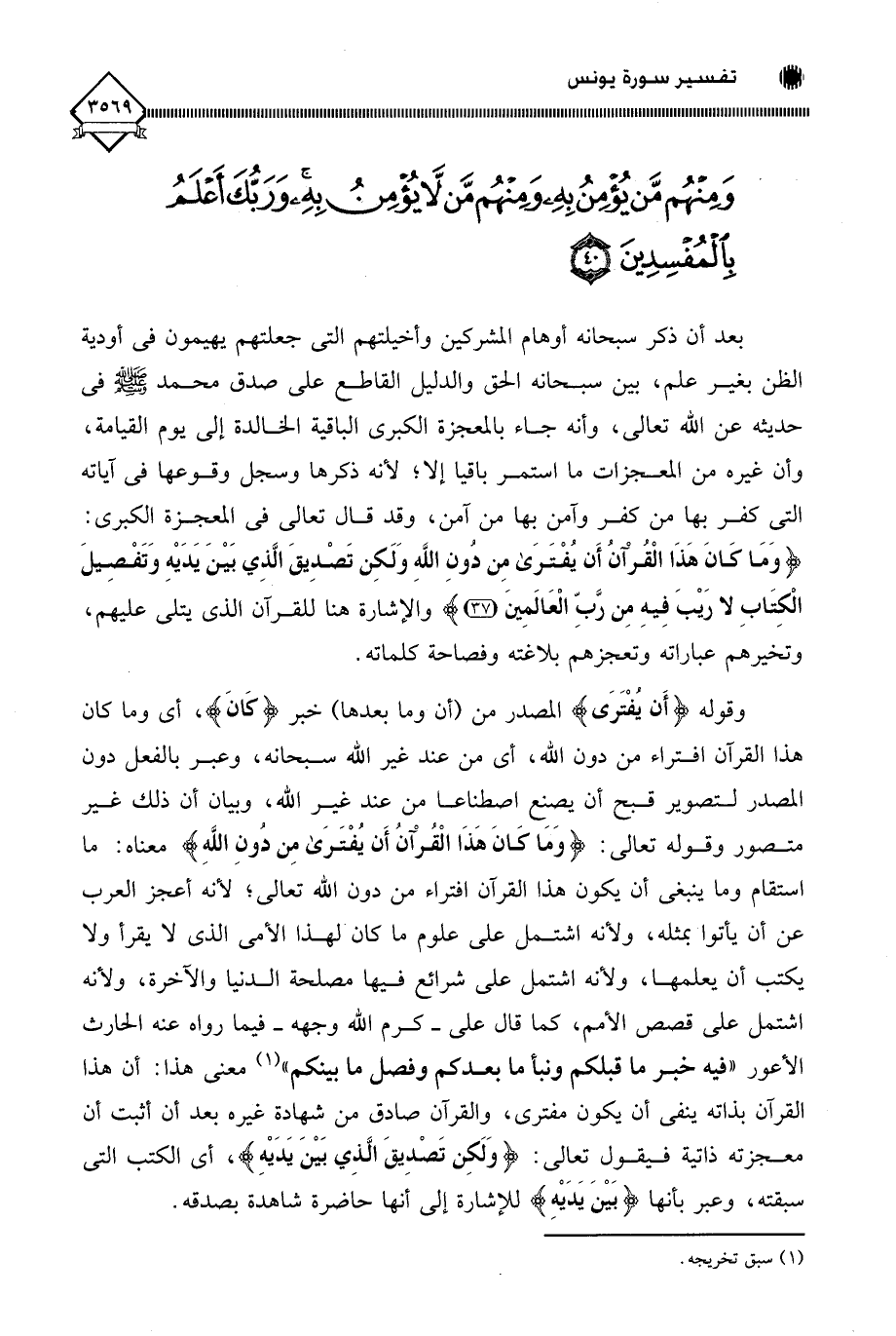 وقوله (أَن يُفْتَرَى) المصدر من (أن وما بعدها) خبر (كَانَ)، أي وما كان هذا القرآن افتراء من دون اللَّه، أي من عند غير اللَّه سبحانه، وعبر بالفعل دون المصدر لتصوير قبح أن يصنع اصطناعا من عند غير اللَّه، وبيان أن ذلك غير متصور وقوله تعالى: (ووَمَا كَانَ هَذَا الْقُرْآنُ أَن يُفْتَرَى مِن دُونِ اللَّهِ) معناه: ما استقام وما ينبغي أن يكون هذا القرآن افتراء من دون اللَّه تعالى؛ لأنه أعجز العرب عن أن يأتوا بمثله، ولأنه اشتمل على علوم ما كان لهذا الأُميّ الذي لَا يقرأ ولا يكتب أن يعلمها، ولأنه اشتمل على شرائع فيها مصلحة الدنيا والآخرة، ولأنه اشتمل على قصص الأمم، كما قال على - كرم اللَّه وجهه - فيما رواه عنه الحارث الأعور " فيه خبر ما قبلكم ونبأ ما بعدكم وفصل ما بينكم " (¬1) معنى هذا: أن هذا القرآن بذاته ينفي أن يكون مفترى، والقرآن صادق من شهادة غيره بعد أن أثبت أن معجزته ذاتية فيقول تعالى: (وَلَكِن تَصْدِيقَ الَّذِي بَيْن يَدَيْهِ)، أي الكتب التي سبقته، وعبر بأنها (بيْنَ يَدَيْهِ) للإشارة إلى أنها حاضرة شاهدة بصدقه.