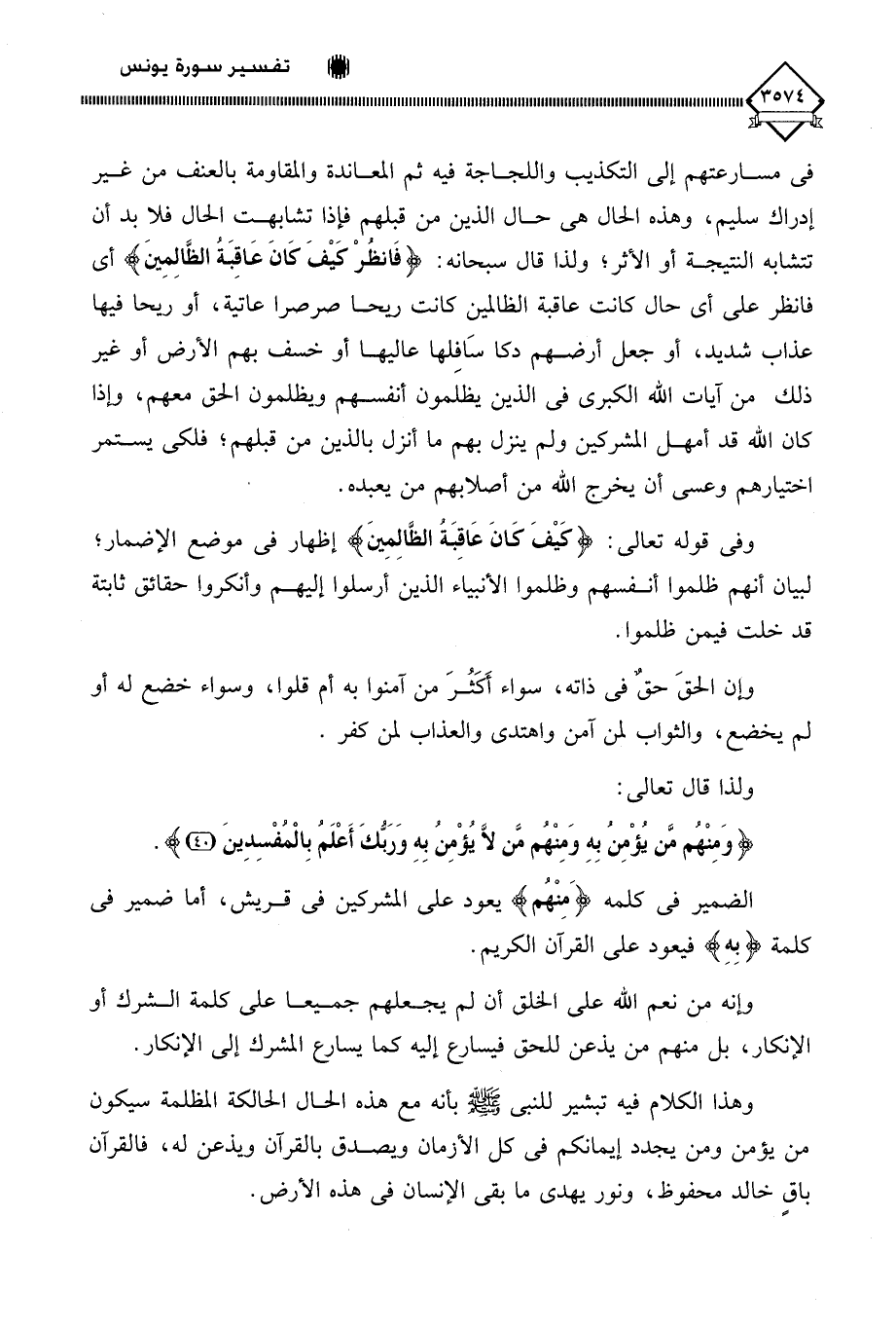 فى مسارعتهم إلى التكذيب واللجاجة فيه ثم المعاندة والمقاومة بالعنف من غير إدراك سليم، وهذه الحال هي حال الذين من قبلهم فإذا تشابهت الحال فلا بد أن تتشابه النتيجة أو الأثر، ولذا قال سبحانه: (فَانظُرْ كَيْفَ كانَ عَاقِبَةُ الظَّالِمِينَ) أي فانظر على أي حال كانت عاقبة الظالمين كانت ريحا صرصرا عاتية، أو ريحا فيها عذاب شديد، أو جعل أرضهم دكا سَافِلها عاليها أو خسف بهم الأرض أو غير ذلك من آيات اللَّه الكبرى في الذين يظلمون أنفسهم ويظلمون الحق معهم، وإذا كان اللَّه قد أمهل المشركين ولم ينزل بهم ما أنزل بالذين من قبلهم، فلكي يستمر اختيارهم وعسى أن يخرج اللَّه من أصلابهم من يعبده.