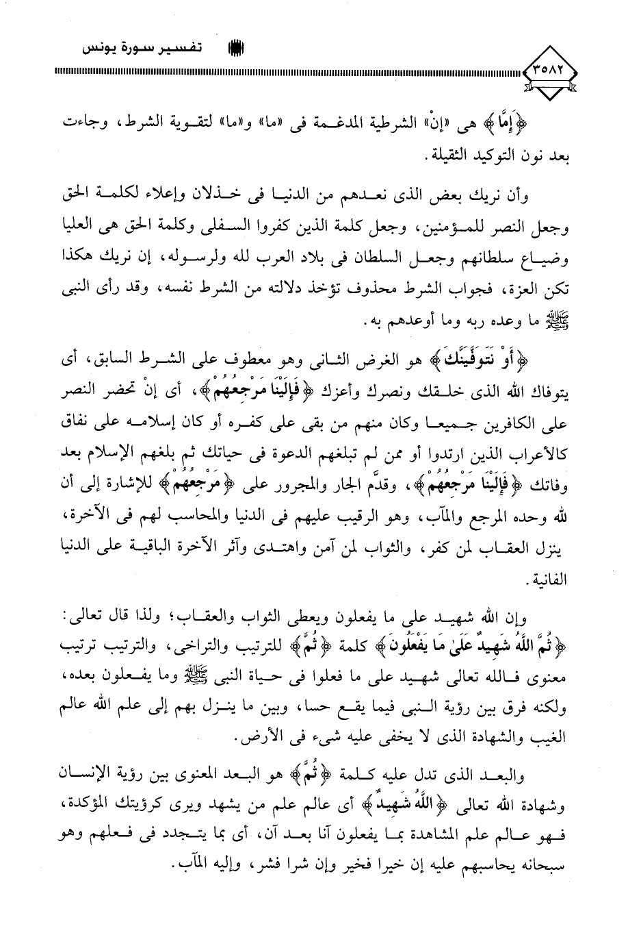 (أَوْ نَتَوَفَيَنَّكَ) هو الغرض الثاني وهو مغطوف على الشرط السابق، أي يتوفاك اللَّه الذي خلقك ونصرك وأعزك (فَإِلَيْنَا مَرْجِعُهُمْ)، أي إنْ تحضر النصر على الكافرين جميعا وكان منهم من بقي على كفره أو كان إسلامه على نفاق كالأعراب الذين ارتدوا أو ممن لم تبلغهم الدعوة في حياتك ثم بلغهم الإسلام بعد وفاتك (فَإِلَيْنَا مرْجِعُهُمْ)، وقدَّم الجار والمجرور على (مَرْجِعُهُمْ) للإشارة إلى أن للَّه وحده المرجع والمآب، وهو الرقيب عليهم في الدنيا والمحاسب لهم في الآخرة، ينزل العقاب لمن كفر، والثواب لمن آمن واهتدى وآثر الآخرة الباقية على الدنيا الفانية.