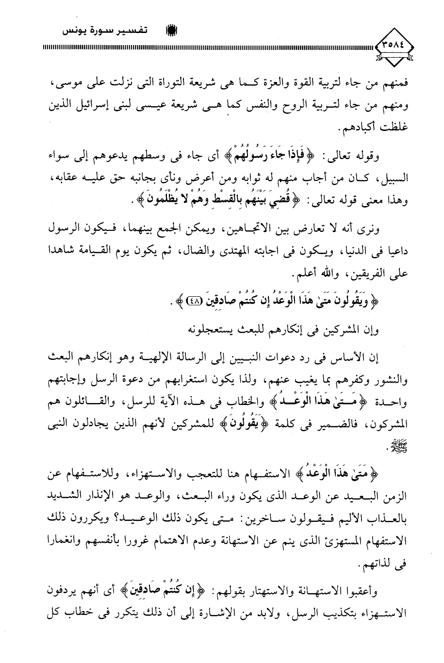 وقوله تعالى: (فَإِذَا جَاءَ رَسُولُهُمْ) أي جاء في وسطهم يدعوهم إلى سواء السبيل، كان من أجاب منهم له ثوابه ومن أعرِض ونأى بجانبه حق عليه عقابه، وهذا معنى قوله تعالى: (قُضِيَ بَيْنَهُمْ بِالْقِسْطِ وَهُمْ لَا يُظْلَمُونَ).