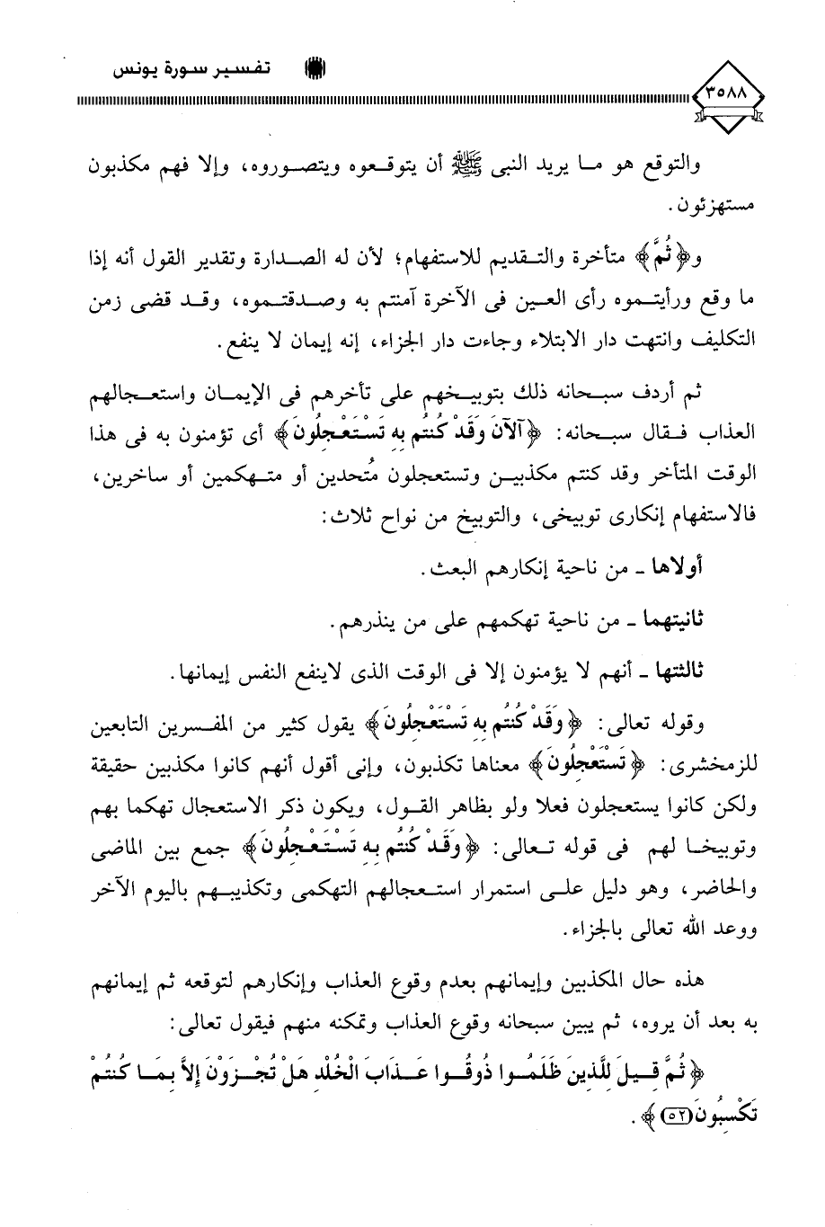 ثم أردف سبحانه ذلك بتوبيخهم على تأخرهم في الإيمان واستعجالهم العذاب فقال سبحانه: (آلآنَ وَقَدْ كُنتُم بِهِ تَسْتَعْجِلونَ) أي تؤمنون به في هذا الوقت المتأخر وقد كنتم مكذبين وتستعجلون مُتحدين أو متهكمين أو ساخرين، فالاستفهام إنكاري توبيخي، والتوبيخ من نواح ثلاث: