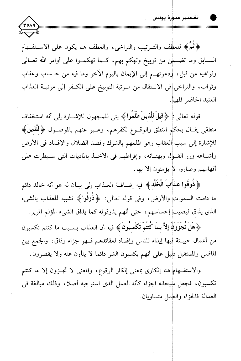 (ثُمَّ) للعطف والترتيب والتراخي، والعطف هنا يكون على الاستفهام السابق وما تضمن من توبيخ وتهكم بهم، كما تهكموا على أوامر اللَّه تعالى ونواهيه من قبل، ودعوتهم إلى الإيمان باليوم الآخر وما فيه من حساب وعقاب وثواب، والتراخي في الانتقال من مرتبة التوبيخ على الكفر إلى مرتبة العذاب العتيد الحاضر المهيأ.