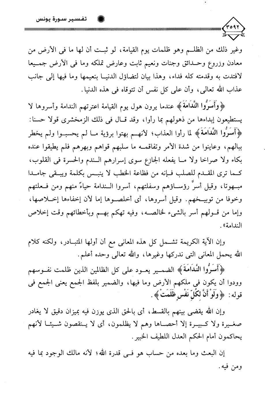 (وَأَسَرُّوا النَّدَامَةَ) عندما يرون هول يوم القيامة اعترتهم الندامة وأسروها لا يستطيعون إبداءها من ذهولهم بما رأوا، وقد قال في ذلك الزمخشري قولا حسنا: (أَسَرُّوا النَّدَامَةَ) لما رأوا العذاب؛ لأنهم بهتوا برؤية ما لم يحسبوا ولم يخطر ببالهم، وعاينوا من شدة الأمر وتفاقمه ما سلبهم قواهم وبهرهم فلم يطيقوا عنده بكاء ولا صراخا ولا ما يفعله الجازع سوى إسرارهم الندم والحسرة في القلوب، كما ترى المقدم للصلب فإنه من فظاعة الخطب لَا ينبس بكلمة ويبقى جامدا مبهوتا، وقيل أسرَّ رؤساؤهم وسفلتهم، أسروا الندامة حياءً منهم ومن فعلتهم وخوفا من توبيخهم. وقيل أسروها، أي أخلصوها إما لأن إخفاءها إخلاصها، وإما من قولهم أسر بالشيء لخالصه، وفيه تهكم بهم وبأخطائهم وقت إخلاص الندامة ".