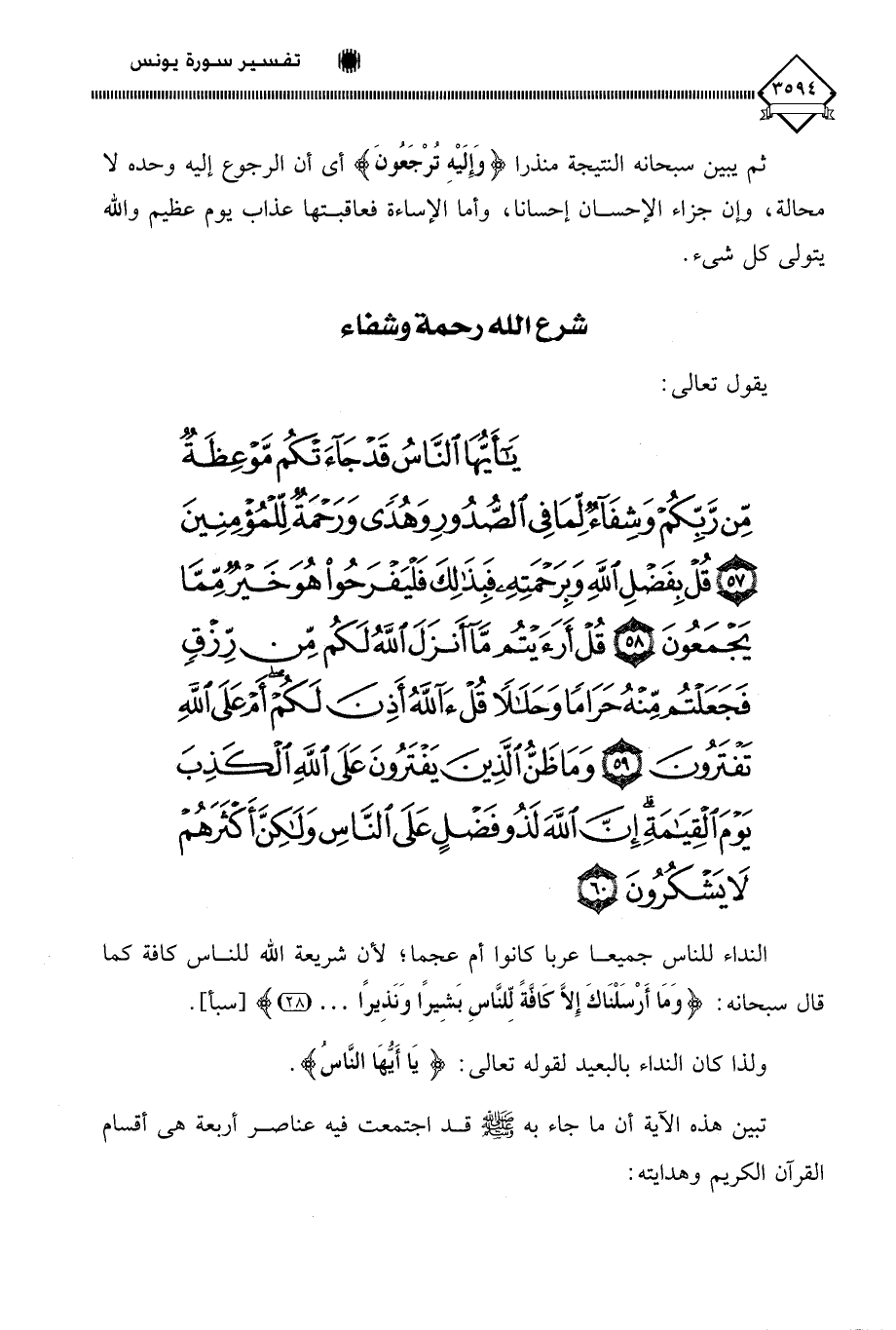 (يَا أَيُّهَا النَّاسُ قَدْ جَاءَتْكُمْ مَوْعِظَةٌ مِنْ رَبِّكُمْ وَشِفَاءٌ لِمَا فِي الصُّدُورِ وَهُدًى وَرَحْمَةٌ لِلْمُؤْمِنِينَ (57) قُلْ بِفَضْلِ اللَّهِ وَبِرَحْمَتِهِ فَبِذَلِكَ فَلْيَفْرَحُوا هُوَ خَيْرٌ مِمَّا يَجْمَعُونَ (58) قُلْ أَرَأَيْتُمْ مَا أَنْزَلَ اللَّهُ لَكُمْ مِنْ رِزْقٍ فَجَعَلْتُمْ مِنْهُ حَرَامًا وَحَلَالًا قُلْ آللَّهُ أَذِنَ لَكُمْ أَمْ عَلَى اللَّهِ تَفْتَرُونَ (59) وَمَا ظَنُّ الَّذِينَ يَفْتَرُونَ عَلَى اللَّهِ الْكَذِبَ يَوْمَ الْقِيَامَةِ إِنَّ اللَّهَ لَذُو فَضْلٍ عَلَى النَّاسِ وَلَكِنَّ أَكْثَرَهُمْ لَا يَشْكُرُونَ (60)
