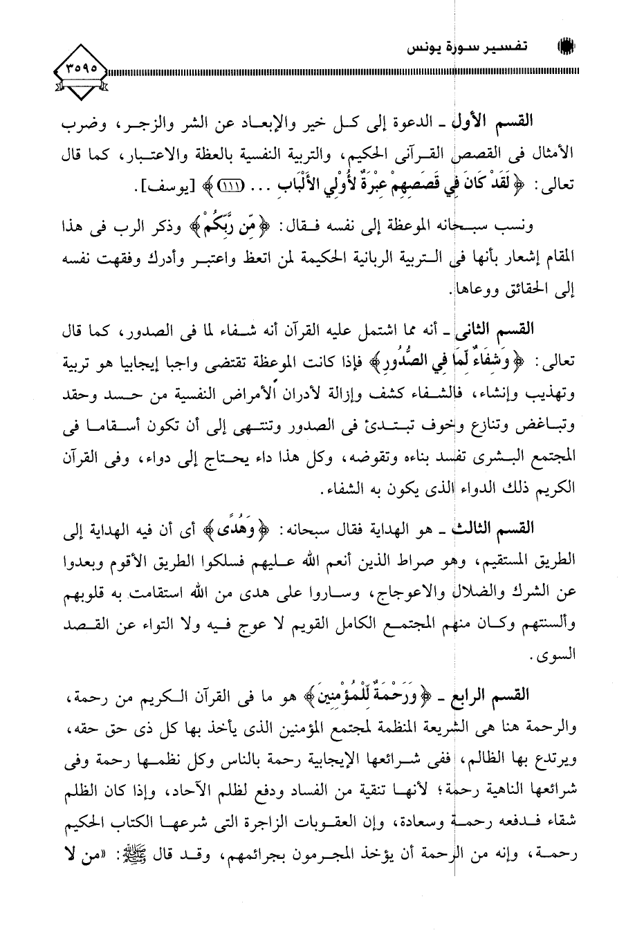 القسم الأول - الدعوة إلى كل خير والإبعاد عن الشر والزجر، وضرب الأمثال في القصص القرآني الحكيم، والتربية النفسية بالعظة والاعتبار، كما قال تعالى: (لَقَدْ كانَ فِي قَصَصِهِمْ عِبْرَةٌ لأُوْلِي الأَلْبَابِ. . .). ونسب سبحانه الموعظة إلى نفسه فقال: (مِّن رَّبِّكُمْ) وذكر الرب في هذا المقام إشعار بأنها في التربية الربانية الحكيمة لمن اتعظ واعتبر وأدرك وفقهت نفسه إلى الحقائق ووعاها.
