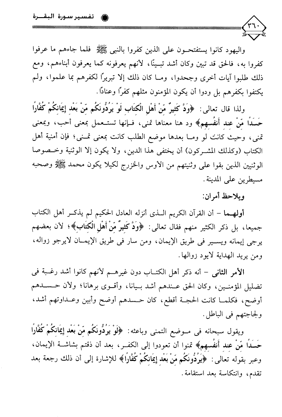 أولهما - أن القرآن الكريم الذي أنزله العادل الحكيم لم يذكر أهل الكتاب جميعا، بل ذكر الكثير منهم فقال تعالى: (وَدَّ كَثِيرٌ منْ أَهْلِ الْكِتَابِ)؛ لأن بعضهم يرجى إيمانه ويسير في طريق الإيمان، ومن سار في طريق الإيمان لَا يرجو زواله، ومن يريد الهداية لَا يود زوالها.