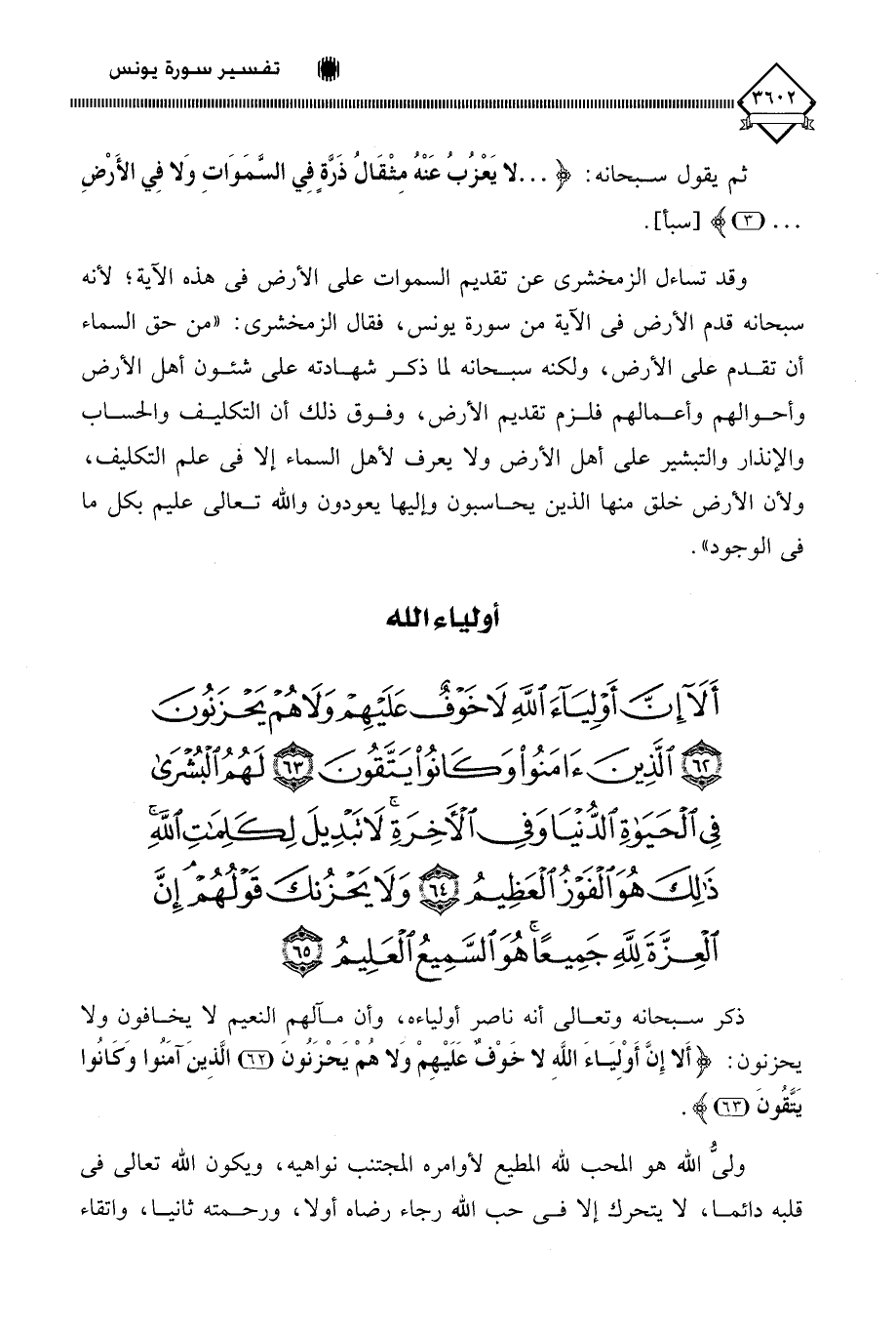 (أَلَا إِنَّ أَوْلِيَاءَ اللَّهِ لَا خَوْفٌ عَلَيْهِمْ وَلَا هُمْ يَحْزَنُونَ (62) الَّذِينَ آمَنُوا وَكَانُوا يَتَّقُونَ (63) لَهُمُ الْبُشْرَى فِي الْحَيَاةِ الدُّنْيَا وَفِي الْآخِرَةِ لَا تَبْدِيلَ لِكَلِمَاتِ اللَّهِ ذَلِكَ هُوَ الْفَوْزُ الْعَظِيمُ (64) وَلَا يَحْزُنْكَ قَوْلُهُمْ إِنَّ الْعِزَّةَ لِلَّهِ جَمِيعًا هُوَ السَّمِيعُ الْعَلِيمُ (65)