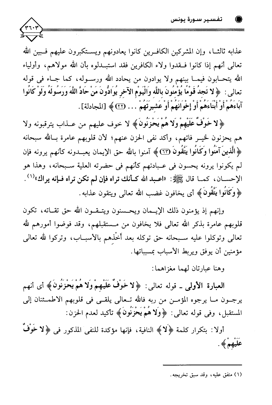 (لا خَوْفٌ عَلَيْهِمْ وَلا هُمْ يَحْزَنُونَ) لَا خوف عليهم من عذاب يترقبونه ولا هم يحزنون لخير فاتهم، وأكد نفي الحزن عنهم؛ لأن قلوبهم عامرة باللَّه سبحانه