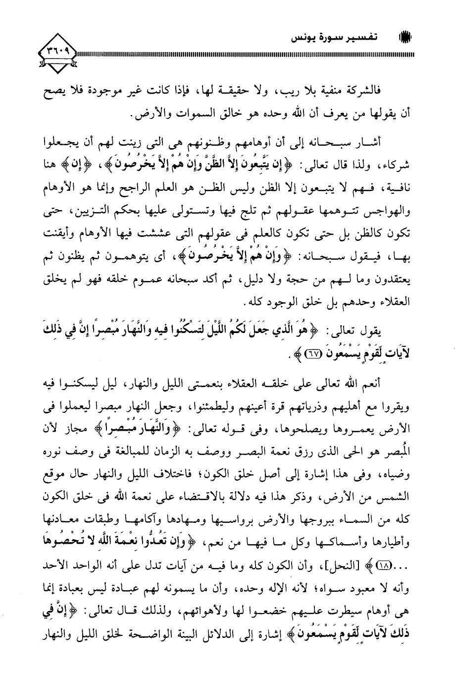 أنعم اللَّه تعالى على خلقه العقلاء بنعمتي الليل والنهار، ليل ليسكنوا فيه ويقروا مع أهليهم وذرياتهم قرة أعينهم وليطمئنوا، وجعل النهار مبصرا ليعملوا في الأرض يعمروها ويصلحوها، وفي قوله تعالى: (وَالنَّهَارَ مُبْصِرًا) مجاز لأن المُبصر هو الحي الذي رزق نعمة البصر ووصف به الزمان للمبالغة في وصف نوره وضياه، وفي هذا إشارة إلى أصل خلق الكون؛ فاختلاف الليل والنهار حال موقع الشمس من الأرض، وذكر هذا فيه دلالة بالاقتضاء على نعمة اللَّه في خلق الكون كله من السماء ببروجها والأرض برواسيها ومهادها وآكامها وطبقات معادنها وأطيارها وأسماكها وكل ما فيها من نعم، (وَإِن تَعُدُّوا نِعْمَةَ اللَّهِ لَا تُحْصُوهَا. . .)، وأن الكون كله وما فيه من آيات تدل على أنه الواحد الأحد وأنه لَا معبود سواه؛ لأنه الإله وحده، وأن ما يسمونه لهم عبادة ليس بعبادة إنما هي أوهام سيطرت عليهم خضعوا لها ولأهوائهم، ولذلك قال تعالى: (إِنَّ فِي ذَلِكَ لآيَاتٍ لِّقَوْم يَسْمَعُونَ) إشارة إلى الدلائل البينة الواضحة لخلق الليل والنهار
