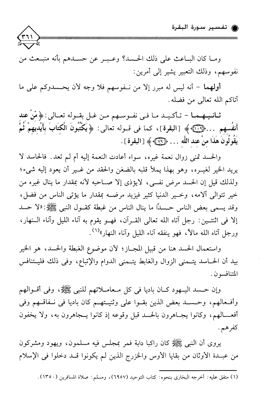 واستعمال الحسد هنا من قبيل المجاز؛ لأن موضوع الغبطة والحسد، هو الخير بيد أن الحاسد يتمنى الزوال والغابط يتمنى الدوام والإتباع، وفي ذلك فليتنافس المتنافسون.