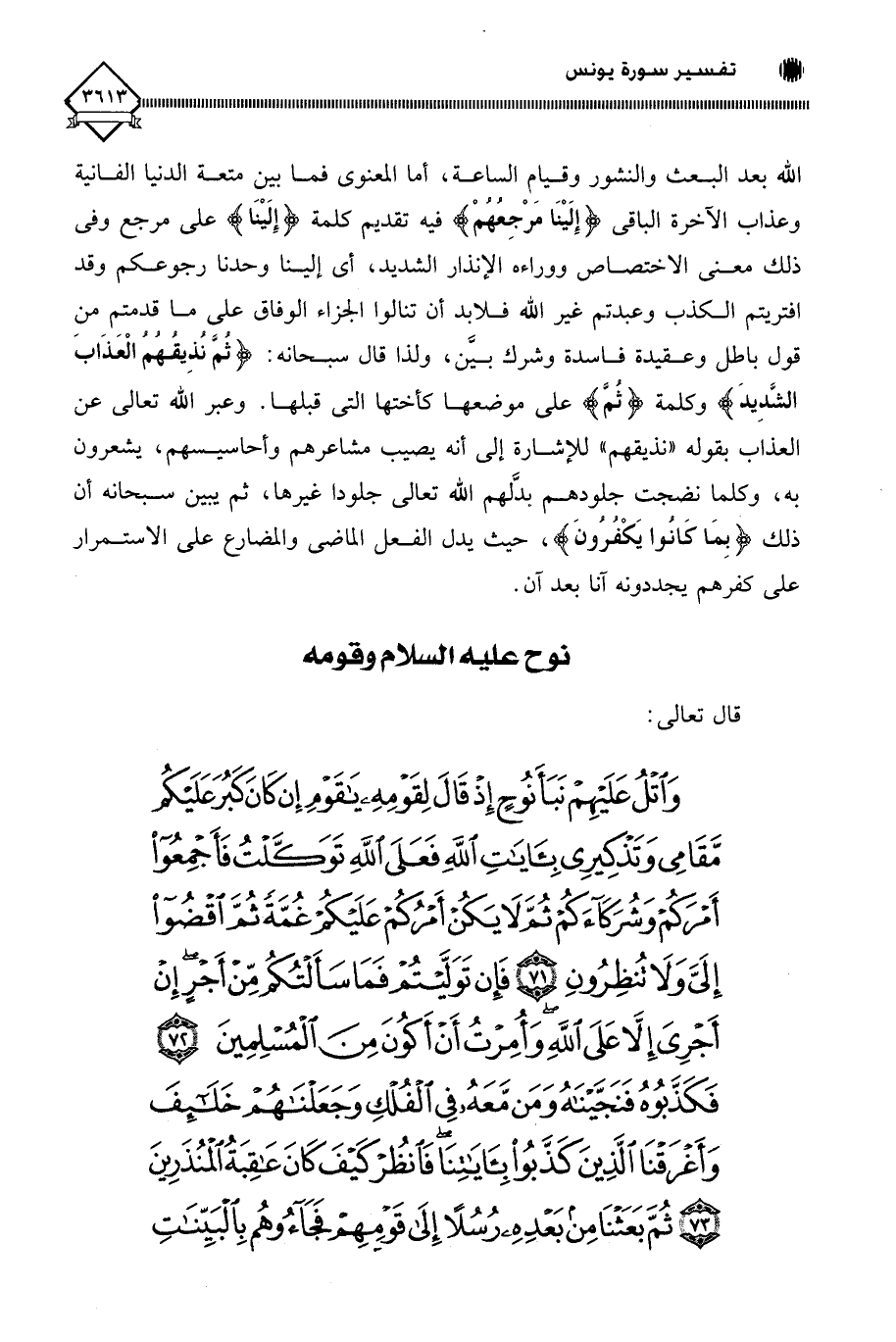 (وَاتْلُ عَلَيْهِمْ نَبَأَ نُوحٍ إِذْ قَالَ لِقَوْمِهِ يَا قَوْمِ إِنْ كَانَ كَبُرَ عَلَيْكُمْ مَقَامِي وَتَذْكِيرِي بِآيَاتِ اللَّهِ فَعَلَى اللَّهِ تَوَكَّلْتُ فَأَجْمِعُوا أَمْرَكُمْ وَشُرَكَاءَكُمْ ثُمَّ لَا يَكُنْ أَمْرُكُمْ عَلَيْكُمْ غُمَّةً ثُمَّ اقْضُوا إِلَيَّ وَلَا تُنْظِرُونِ (71) فَإِنْ تَوَلَّيْتُمْ فَمَا سَأَلْتُكُمْ مِنْ أَجْرٍ إِنْ أَجْرِيَ إِلَّا عَلَى اللَّهِ وَأُمِرْتُ أَنْ أَكُونَ مِنَ الْمُسْلِمِينَ (72) فَكَذَّبُوهُ فَنَجَّيْنَاهُ وَمَنْ مَعَهُ فِي الْفُلْكِ وَجَعَلْنَاهُمْ خَلَائِفَ وَأَغْرَقْنَا الَّذِينَ كَذَّبُوا بِآيَاتِنَا فَانْظُرْ كَيْفَ كَانَ عَاقِبَةُ الْمُنْذَرِينَ (73) ثُمَّ بَعَثْنَا مِنْ بَعْدِهِ رُسُلًا إِلَى قَوْمِهِمْ فَجَاءُوهُمْ بِالْبَيِّنَاتِ