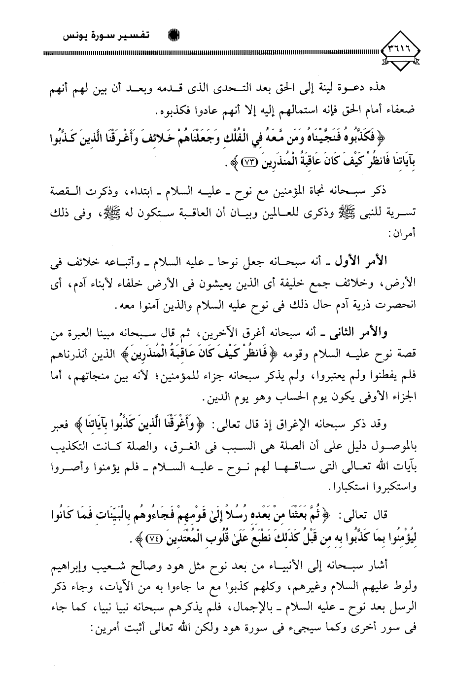 ذكر سبحانه نجاة المؤمنين مع نوح - عليه السلام - ابتداء، وذكرت القصة تسرية للنبي - صلى الله عليه وسلم - وذكرى للعالمين وبيان أن العاقبة ستكون له - صلى الله عليه وسلم -، وفي ذلك أمران: الأمر الأول - أنه سبحانه جعل نوحا - عليه السلام - وأتباعه خلائف في الأرض، وخلائف جمع خليفة أي الذين يعيشون في الأرض خلفاء لأبناء آدم، أي انحصرت ذرية آدم حال ذلك في نوح عليه السلام والذين آمنوا معه.