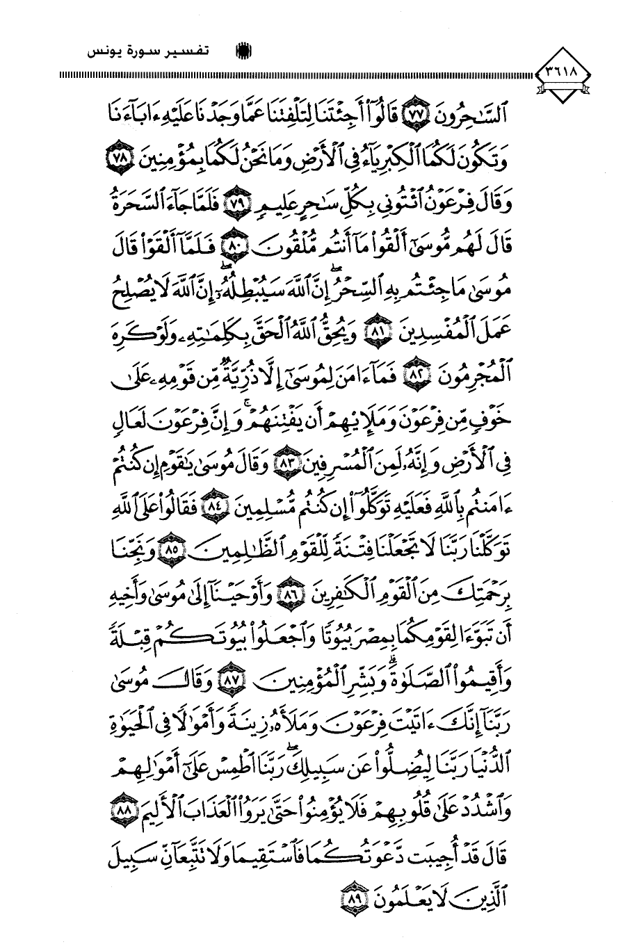 السَّاحِرُونَ (77) قَالُوا أَجِئْتَنَا لِتَلْفِتَنَا عَمَّا وَجَدْنَا عَلَيْهِ آبَاءَنَا وَتَكُونَ لَكُمَا الْكِبْرِيَاءُ فِي الْأَرْضِ وَمَا نَحْنُ لَكُمَا بِمُؤْمِنِينَ (78) وَقَالَ فِرْعَوْنُ ائْتُونِي بِكُلِّ سَاحِرٍ عَلِيمٍ (79) فَلَمَّا جَاءَ السَّحَرَةُ قَالَ لَهُمْ مُوسَى أَلْقُوا مَا أَنْتُمْ مُلْقُونَ (80) فَلَمَّا أَلْقَوْا قَالَ مُوسَى مَا جِئْتُمْ بِهِ السِّحْرُ إِنَّ اللَّهَ سَيُبْطِلُهُ إِنَّ اللَّهَ لَا يُصْلِحُ عَمَلَ الْمُفْسِدِينَ (81) وَيُحِقُّ اللَّهُ الْحَقَّ بِكَلِمَاتِهِ وَلَوْ كَرِهَ الْمُجْرِمُونَ (82) فَمَا آمَنَ لِمُوسَى إِلَّا ذُرِّيَّةٌ مِنْ قَوْمِهِ عَلَى خَوْفٍ مِنْ فِرْعَوْنَ وَمَلَإِهِمْ أَنْ يَفْتِنَهُمْ وَإِنَّ فِرْعَوْنَ لَعَالٍ فِي الْأَرْضِ وَإِنَّهُ لَمِنَ الْمُسْرِفِينَ (83) وَقَالَ مُوسَى يَا قَوْمِ إِنْ كُنْتُمْ آمَنْتُمْ بِاللَّهِ فَعَلَيْهِ تَوَكَّلُوا إِنْ كُنْتُمْ مُسْلِمِينَ (84) فَقَالُوا عَلَى اللَّهِ تَوَكَّلْنَا رَبَّنَا لَا تَجْعَلْنَا فِتْنَةً لِلْقَوْمِ الظَّالِمِينَ (85) وَنَجِّنَا بِرَحْمَتِكَ مِنَ الْقَوْمِ الْكَافِرِينَ (86) وَأَوْحَيْنَا إِلَى مُوسَى وَأَخِيهِ أَنْ تَبَوَّءَا لِقَوْمِكُمَا بِمِصْرَ بُيُوتًا وَاجْعَلُوا بُيُوتَكُمْ قِبْلَةً وَأَقِيمُوا الصَّلَاةَ وَبَشِّرِ الْمُؤْمِنِينَ (87) وَقَالَ مُوسَى رَبَّنَا إِنَّكَ آتَيْتَ فِرْعَوْنَ وَمَلَأَهُ زِينَةً وَأَمْوَالًا فِي الْحَيَاةِ الدُّنْيَا رَبَّنَا لِيُضِلُّوا عَنْ سَبِيلِكَ رَبَّنَا اطْمِسْ عَلَى أَمْوَالِهِمْ وَاشْدُدْ عَلَى قُلُوبِهِمْ فَلَا يُؤْمِنُوا حَتَّى يَرَوُا الْعَذَابَ الْأَلِيمَ (88) قَالَ قَدْ أُجِيبَتْ دَعْوَتُكُمَا فَاسْتَقِيمَا وَلَا تَتَّبِعَانِّ سَبِيلَ الَّذِينَ لَا يَعْلَمُونَ (89)