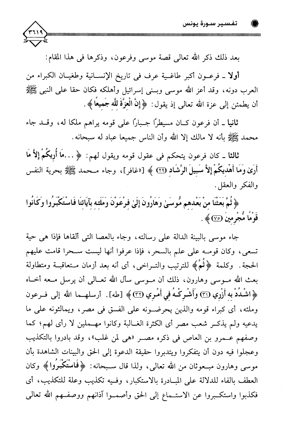 جاء موسى بالبينة الدالة على رسالته، وجاء بالعصا التي ألقاها فإذا هي حية تسعى، وكان قومه على علم بالسحر، فإذا عرفوا أنها ليست سحرا قامت عليهم الحجة. وكلمة (ثُمَّ) للترتيب والتراخي، أي أنه بعد أزمان متعاقبة ومتطاولة بعث اللَّه موسى وهارون، ذلك أن موسى سأل اللَّه تعالى أن يرسل معه أخاه (اشْدُدْ بِهِ أَزْرِي وَأَشْرِكْهُ فِي أَمْرِي). أرسلهما اللَّه إلى فرعون وملئه، أي كبراء قومه والذين يحرضونه على الفسق في مصر، ويمالئونه على ما يدعيه ولم يذكر شعب مصر أي الكثرة الغالبة وكانوا مهملين لَا رأي لهم؛ كما وصفهم عمرو بن العاص في ذكره مصر " هى لمن غلب "، وقد بادروا بالتكذيب وعجلوا فيه دون أن يتفكروا ويتدبروا حقيقة الدعوة إلى الحق والبينات الشاهدة بأن موسى وهارون مبعوثان من اللَّه تعالى، ولذا قال سبحانه: (فَاسْتَكْبَرُوا) وكان العطف بالفاء للدلالة على المبادرة بالاستكبار، وفيه تكذيب وعلة للتكذيب، أي فكذبوا واستكبروا عن الاستماع إلى الحق وأصموا آذانهم ووصفهم اللَّه تعالى