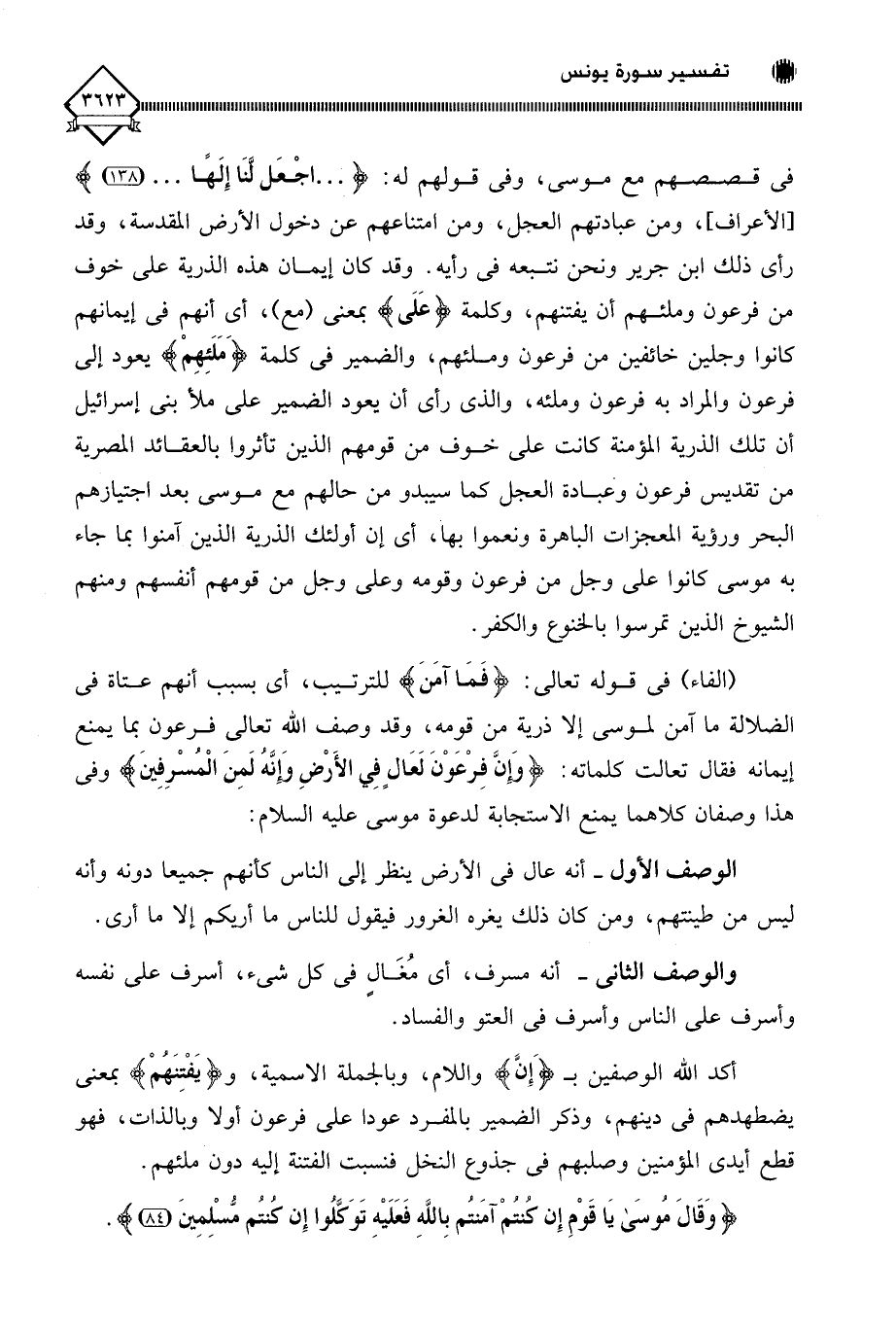 ومن عبادتهم العجل، ومن امتناعهم عن دخول الأرض المقدسة، وقد رأى ذلك ابن جرير ونحن نتبعه في رأيه. وقد كان إيمان هذه الذرية على خوف من فرعون وملئهم أن يفتنهم، وكلمة (عَلَى) بمعنى (مع)، أي أنهم في إيمانهم كانوا وجلين خائفين من فرعون وملئهم، والضمير في كلمة (مَلَئِهِمْ) يعود إلى فرعون والمراد به فرعون وملئه، والذي رأى أن يعود الضمير على ملأ بني إسرائيل أن تلك الذرية المؤمنة كانت على خوف من قومهم الذين تأثروا بالعقائد المصرية من تقديس فرعون وعبادة العجل كما سيبدو من حالهم مع موسى بعد اجتيازهم البحر ورؤية المعجزات الباهرة ونعموا بها، أي إن أولئك الذرية الذين آمنوا بما جاء به موسى كانوا على وجل من فرعون وقومه وعلى وجل من قومهم أنفسهم ومنهم الشيوخ الذين تمرسوا بالخنوع و. الكفر.
