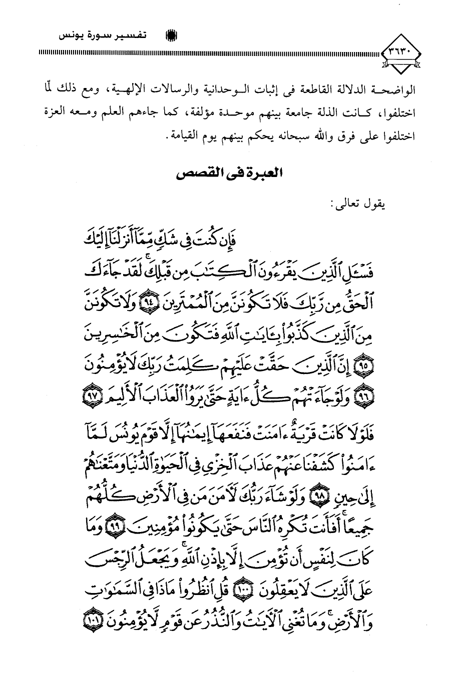 (فَإِنْ كُنْتَ فِي شَكٍّ مِمَّا أَنْزَلْنَا إِلَيْكَ فَاسْأَلِ الَّذِينَ يَقْرَءُونَ الْكِتَابَ مِنْ قَبْلِكَ لَقَدْ جَاءَكَ الْحَقُّ مِنْ رَبِّكَ فَلَا تَكُونَنَّ مِنَ الْمُمْتَرِينَ (94) وَلَا تَكُونَنَّ مِنَ الَّذِينَ كَذَّبُوا بِآيَاتِ اللَّهِ فَتَكُونَ مِنَ الْخَاسِرِينَ (95) إِنَّ الَّذِينَ حَقَّتْ عَلَيْهِمْ كَلِمَتُ رَبِّكَ لَا يُؤْمِنُونَ (96) وَلَوْ جَاءَتْهُمْ كُلُّ آيَةٍ حَتَّى يَرَوُا الْعَذَابَ الْأَلِيمَ (97) فَلَوْلَا كَانَتْ قَرْيَةٌ آمَنَتْ فَنَفَعَهَا إِيمَانُهَا إِلَّا قَوْمَ يُونُسَ لَمَّا آمَنُوا كَشَفْنَا عَنْهُمْ عَذَابَ الْخِزْيِ فِي الْحَيَاةِ الدُّنْيَا وَمَتَّعْنَاهُمْ إِلَى حِينٍ (98) وَلَوْ شَاءَ رَبُّكَ لَآمَنَ مَنْ فِي الْأَرْضِ كُلُّهُمْ جَمِيعًا أَفَأَنْتَ تُكْرِهُ النَّاسَ حَتَّى يَكُونُوا مُؤْمِنِينَ (99) وَمَا كَانَ لِنَفْسٍ أَنْ تُؤْمِنَ إِلَّا بِإِذْنِ اللَّهِ وَيَجْعَلُ الرِّجْسَ عَلَى الَّذِينَ لَا يَعْقِلُونَ (100) قُلِ انْظُرُوا مَاذَا فِي السَّمَاوَاتِ وَالْأَرْضِ وَمَا تُغْنِي الْآيَاتُ وَالنُّذُرُ عَنْ قَوْمٍ لَا يُؤْمِنُونَ (101)