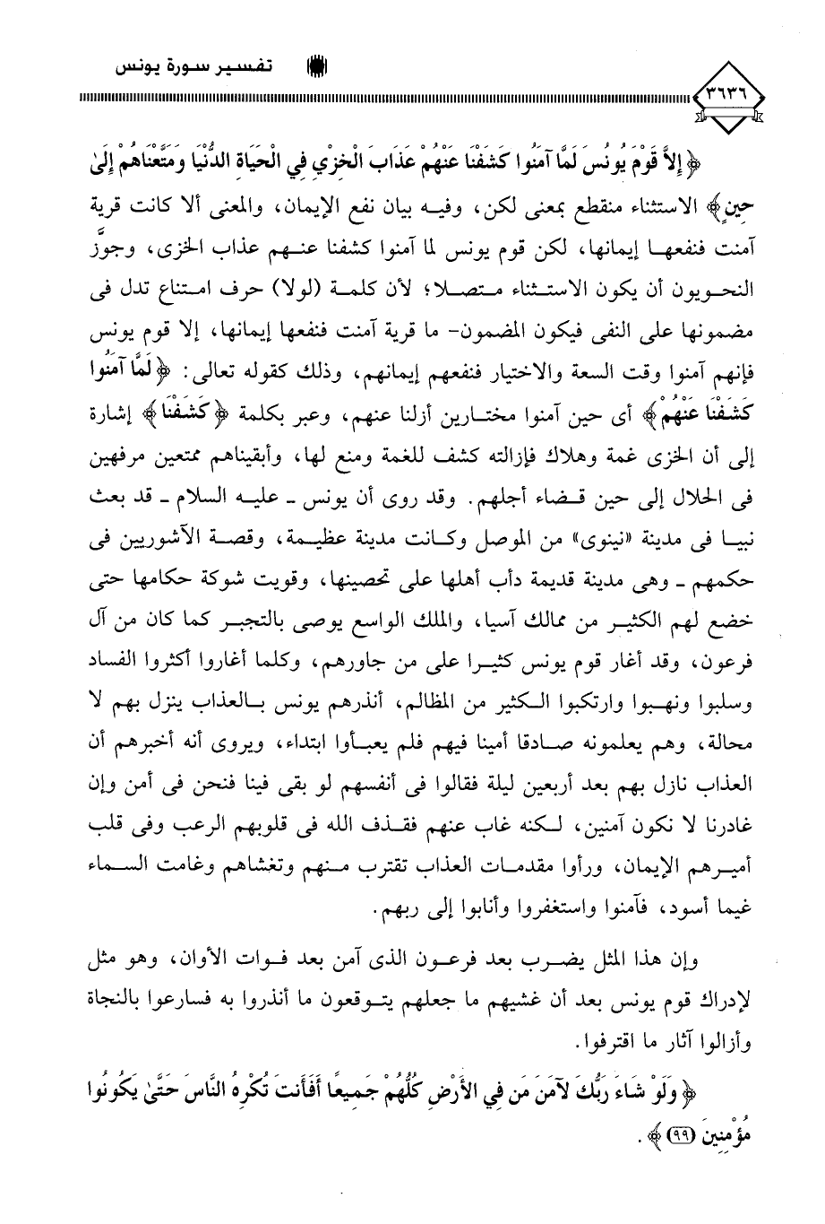 (إِلَّا قَوْمَ يُونُسَ لَمَّا آمَنُوا كَشَفْنَا عَنْهُمْ عَذَابَ الْخِزْيِ فِي الْحَيَاةِ الدُّنْيَا وَمَتَّعْنَاهُمْ إِلَى حِينٍ) الاستثناء منقطع بمعنى لكن، وفيه بيان نفع الإيمان، والمعنى ألَا كانت قرية آمنت فنفعها إيمانها، لكن قوم يونس لما آمنوا كشفنا عنهم عذاب الخزي، وجوَّز النحويون أن يكون الاستثناء متصلا، لأن كلمة (لولا) حرف امتناع تدل في مضمونها على النفي فيكون المضمون - ما قرية آمنت فنفعها إيمانها، إلا قوم يونس فإنهم آمنوا وقت السعة والاختيار فنفعهم إيمانهم، وذلك كقوله تعالى: (لَمَّا آمَنُوا كَشَفْنَا عَنْهُمْ) أي حين آمنوا مختارين أزلنا عنهم، وعبر بكلمة (كَشَفْنَا) إشارة إلى أن الخزي غمة وهلاك فإزالته كشف للغمة ومنع لها، وأبقيناهم ممتعين مرفهين في الحلال إلى حين قضاء أجلهم. وقد روي أن يونس - عليه السلام - قد بعث نبيا في مدينة " نينوى " من الموصل وكانت مدينة عظيمة، وقصة الآشوريين في حكمهم - وهي مدينة قديمة دأب أهلها على تحصينها، وقويت شوكة حكامها حتى خضع لهم الكثير من ممالك آسيا، والملك الواسع يوصي بالتجبر كما كان من آل فرعون، وقد أغار قوم يونس كثيرا على من جاورهم، وكلما أغاروا أكثروا الفساد وسلبوا ونهبوا وارتكبوا الكثير من المظالم، أنذرهم يونس بالعذاب ينزل بهم لا محالة، وهم يعلمونه صادقا أمينا فيهم فلم يعبأوا ابتداء، ويروى أنه أخبرهم أن العذاب نازل بهم بعد أربعين ليلة فقالوا في أنفسهم لو بقي فينا فنحن في أمن وإن غادرنا لَا نكون آمنين، لكنه غاب عنهم فقذف الله في قلوبهم الرعب وفي قلب أميرهم الإيمان، ورأوا مقدمات العذاب تقترب منهم وتغشاهم وغامت السماء غيما أسود، فآمنوا واستغفروا وأنابوا إلى ربهم.