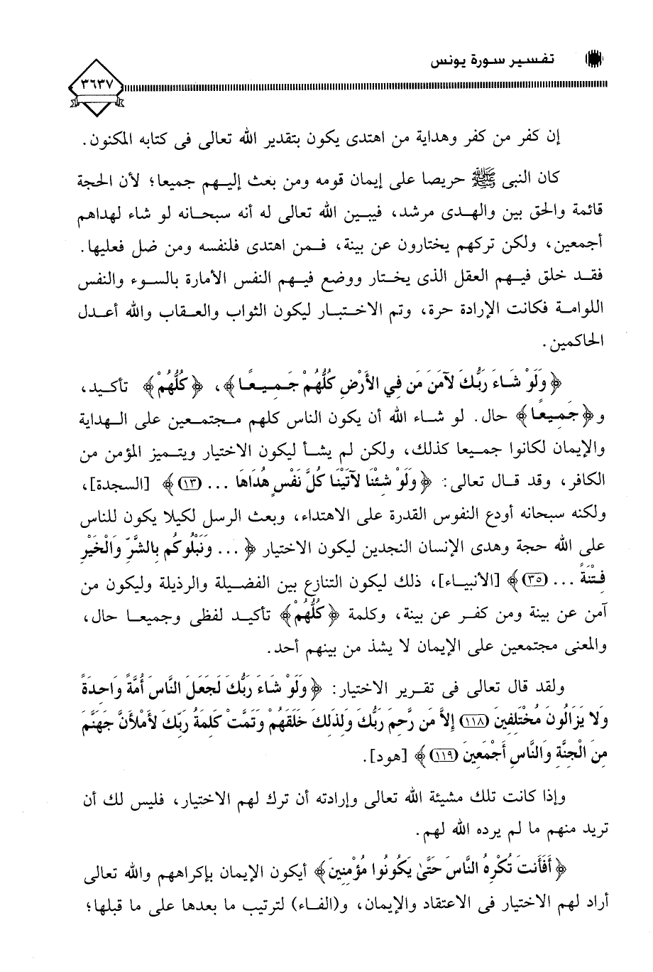 ولقد قال تعالى في تقرير الاختيار: (وَلَوْ شَاءَ رَبُّكَ لَجَعَلَ النَّاسَ أُمَّةً وَاحِدَةً وَلَا يَزَالُونَ مُخْتَلِفِينَ (118) إِلَّا مَنْ رَحِمَ رَبُّكَ وَلِذَلِكَ خَلَقَهُمْ وَتَمَّتْ كَلِمَةُ رَبِّكَ لَأَمْلَأَنَّ جَهَنَّمَ مِنَ الْجِنَّةِ وَالنَّاسِ أَجْمَعِينَ (119).
