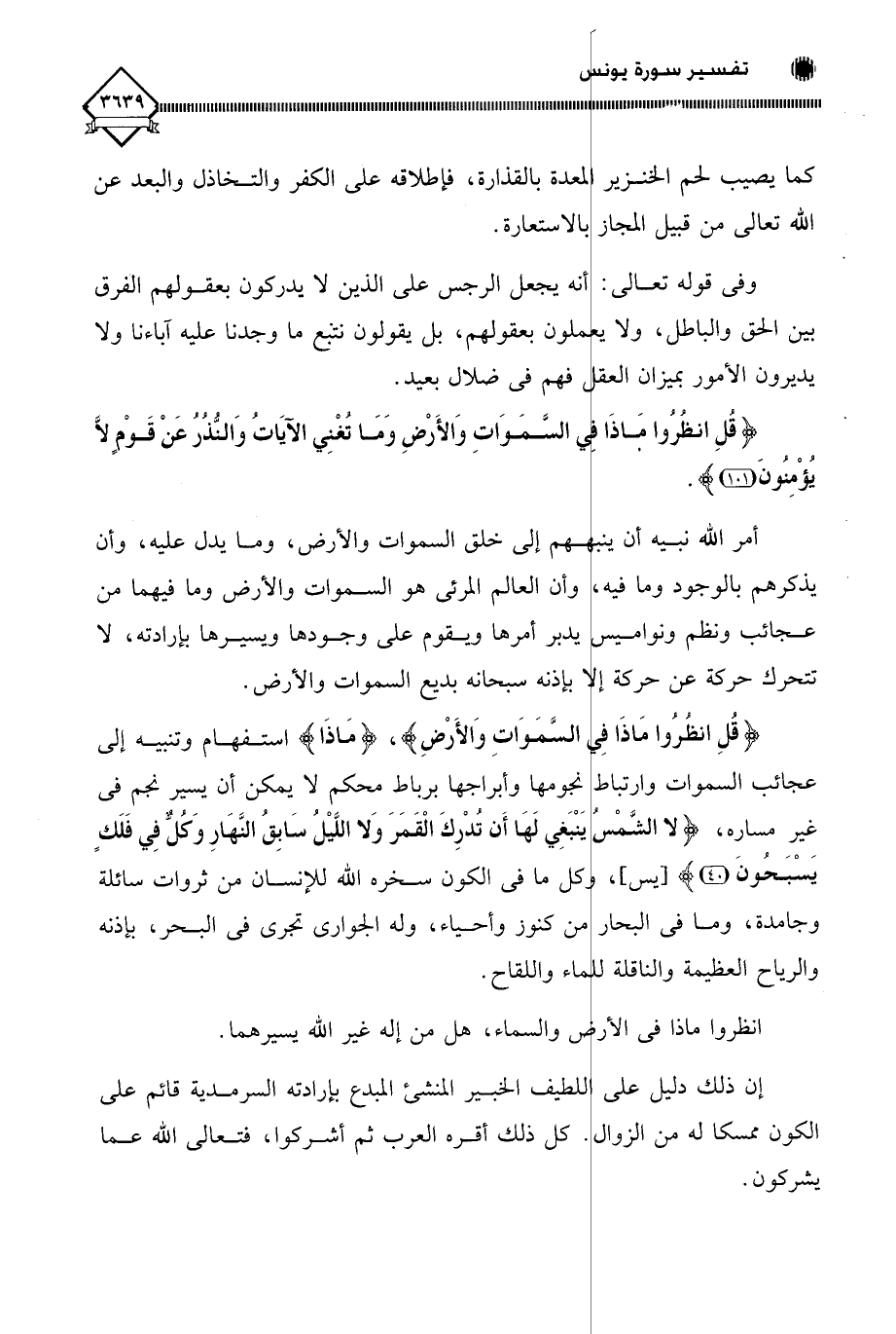 (قُلِ انْظُرُوا مَاذَا فِي السَّمَاوَاتِ وَالْأَرْضِ)، (مَاذَا) استفهام وتنبيه إلى عجائب السماوات وارتباط نجومها وأبراجها برباط محكم لَا يمكن أن يسير نجم في غير مساره، (لَا الشَّمْسُ يَنْبَغِي لَهَا أَنْ تُدْرِكَ الْقَمَرَ وَلَا اللَّيْلُ سَابِقُ النَّهَارِ وَكُلٌّ فِي فَلَكٍ يَسْبَحُونَ (40)، كل ما في الكون سخره اللَّه للإنسان من ثروات سائلة وجامدة، وما في البحار من كنوز وأحياء، وله الجواري تجري في البحر، بإذنه والرياح العظيمة والناقلة للماء واللقاح.