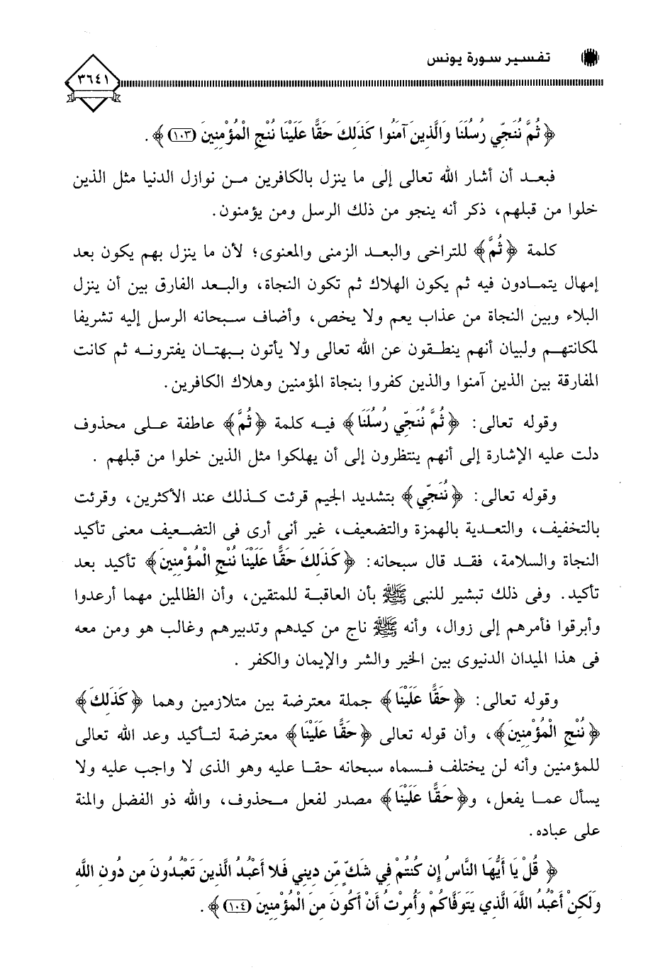 وقوله تعالى: (حَقًّا عَلَيْنَا) جملة معترضة بين متلازمين وهما (كَذَلِكَ) (ننْج الْمُؤْمِنِينَ)، وأن قوله تعالى (حَقًّا عَلَيْنَا) معترضة لتأكيد وعد اللَّه تعالى للمؤمنين وأنه لن يختلف فسماه سبحانه حقا عليه وهو الذي لَا واجب عليه ولا يسأل عما يفعل، و (حَقًّا عَلَيْنَا) مصدر لفعل محذوف، واللَّه ذو الفضل والمنة على عباده.